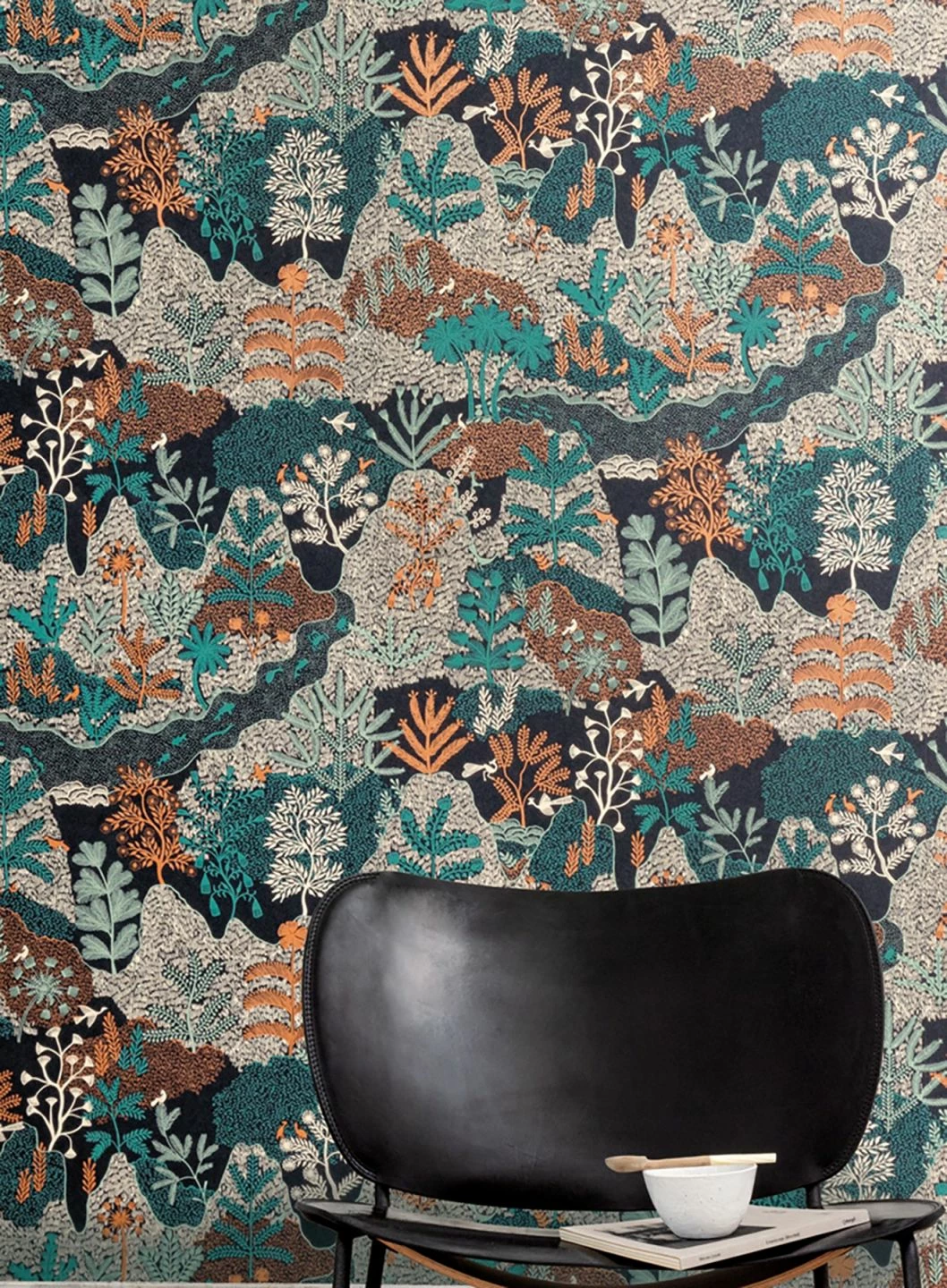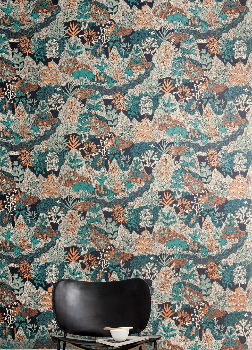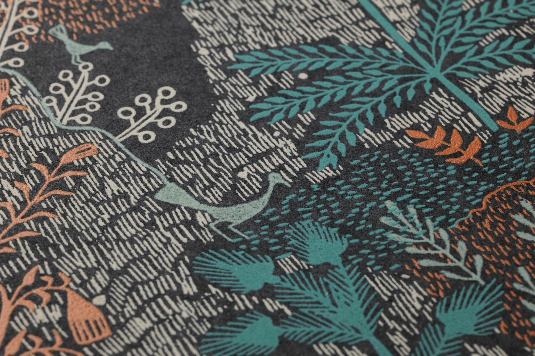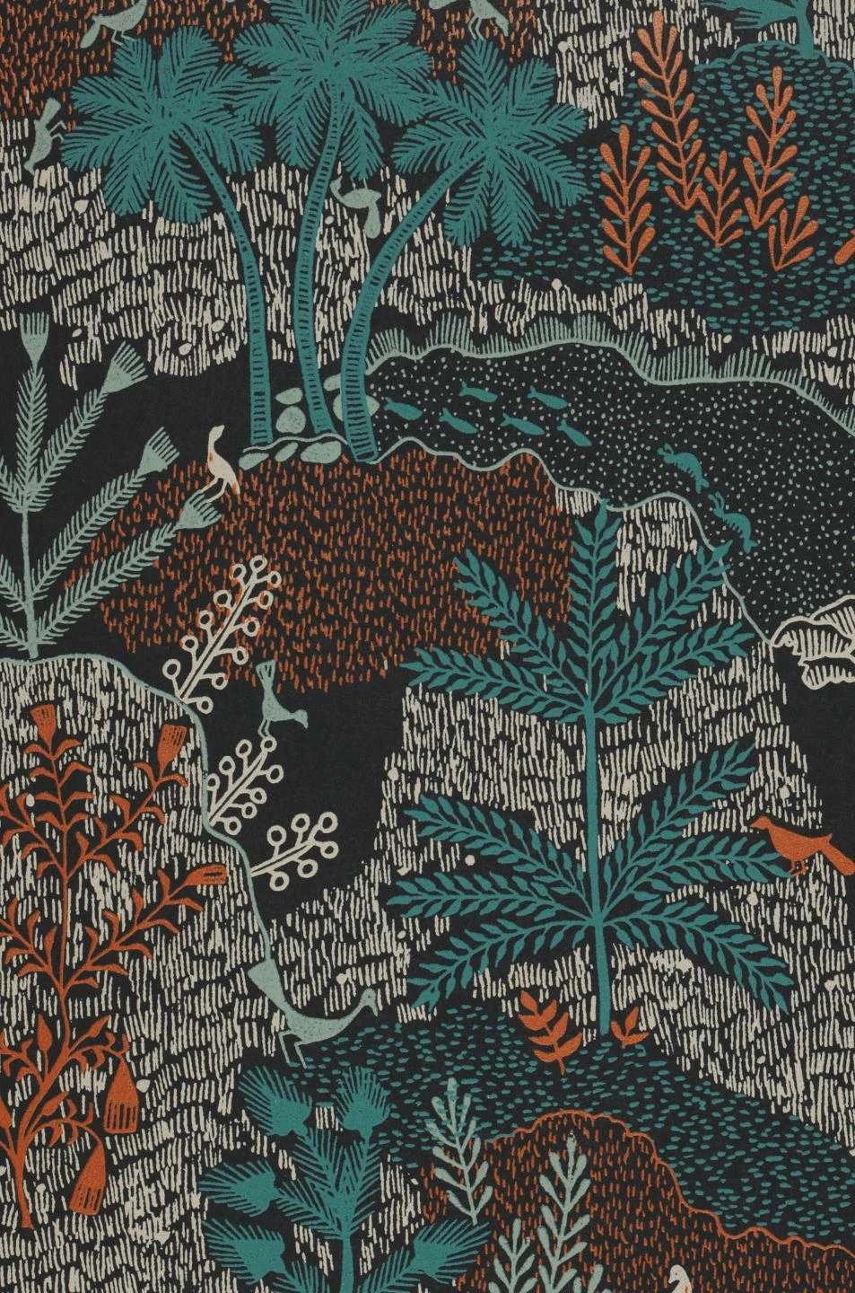 Eine abwechslungsreiche Landschaft mit Bergen und Tälern, Flüssen, verschiedenen Bäumen, Fischen und Vögeln entsteht durch feine Linien und Schraffuren in intensiven Farben auf schwarzem Grund. Besonders der Perlkupferton und das Pastell- und Minttürkis, aber auch das Grauweiß entwickeln vor dem dunklen Hintergrund beeindruckende Leuchtkraft. Durch die Anordnung der überlappenden Landschaftselemente entsteht ein Eindruck von Weite.