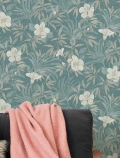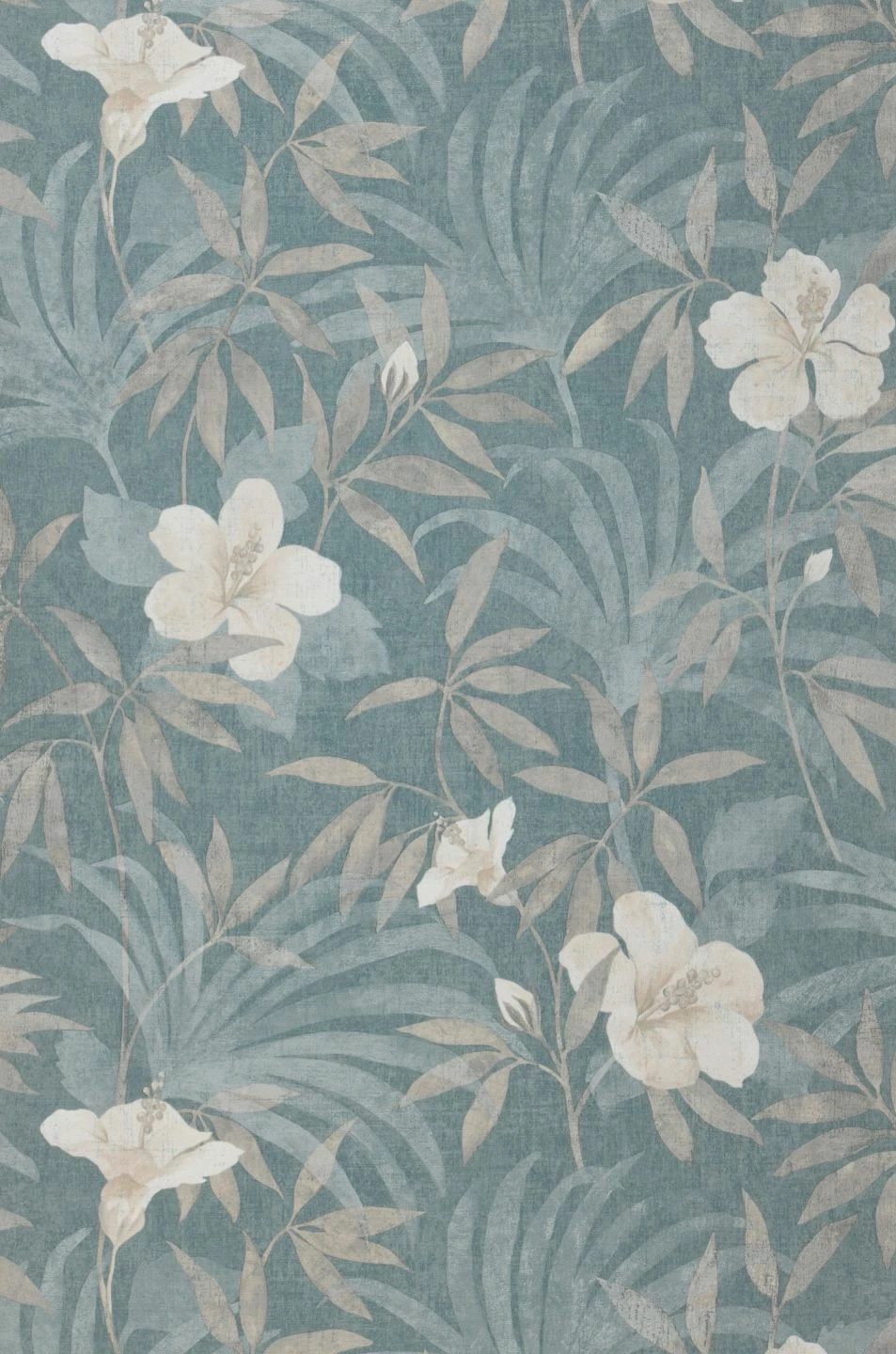 Stilvoll aufeinander abgestimmt sind das Cremeweiß der großen Blüten und das helle Pastelltürkis und Kieselgrau der exotischen Blattranken. In der Verbindung mit dem minttürkisen Untergrund entsteht ein wirkungsvolles Gesamtbild mit dem Eindruck eines undurchdringlichen Blätterwaldes. Die leicht strukturierte Oberfläche aus Vinyl lässt die Tapete auch im Badezimmer problemlos zur Geltung kommen.