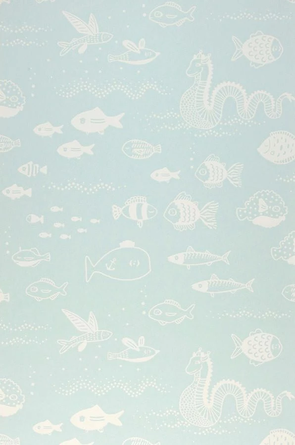 Pastelltürkis bildet das große Meer ab, in dem sich die weißen Silhouettenfische pudelwohl fühlen, wie die spritzigen Wasserbläschen beweisen. Die waschbeständige Kindertapete von Majvillan erschafft eine atmosphärisch kunstvolle Unterwasserwelt, die sich für thematische Raumgestaltung wunderbar anbietet.