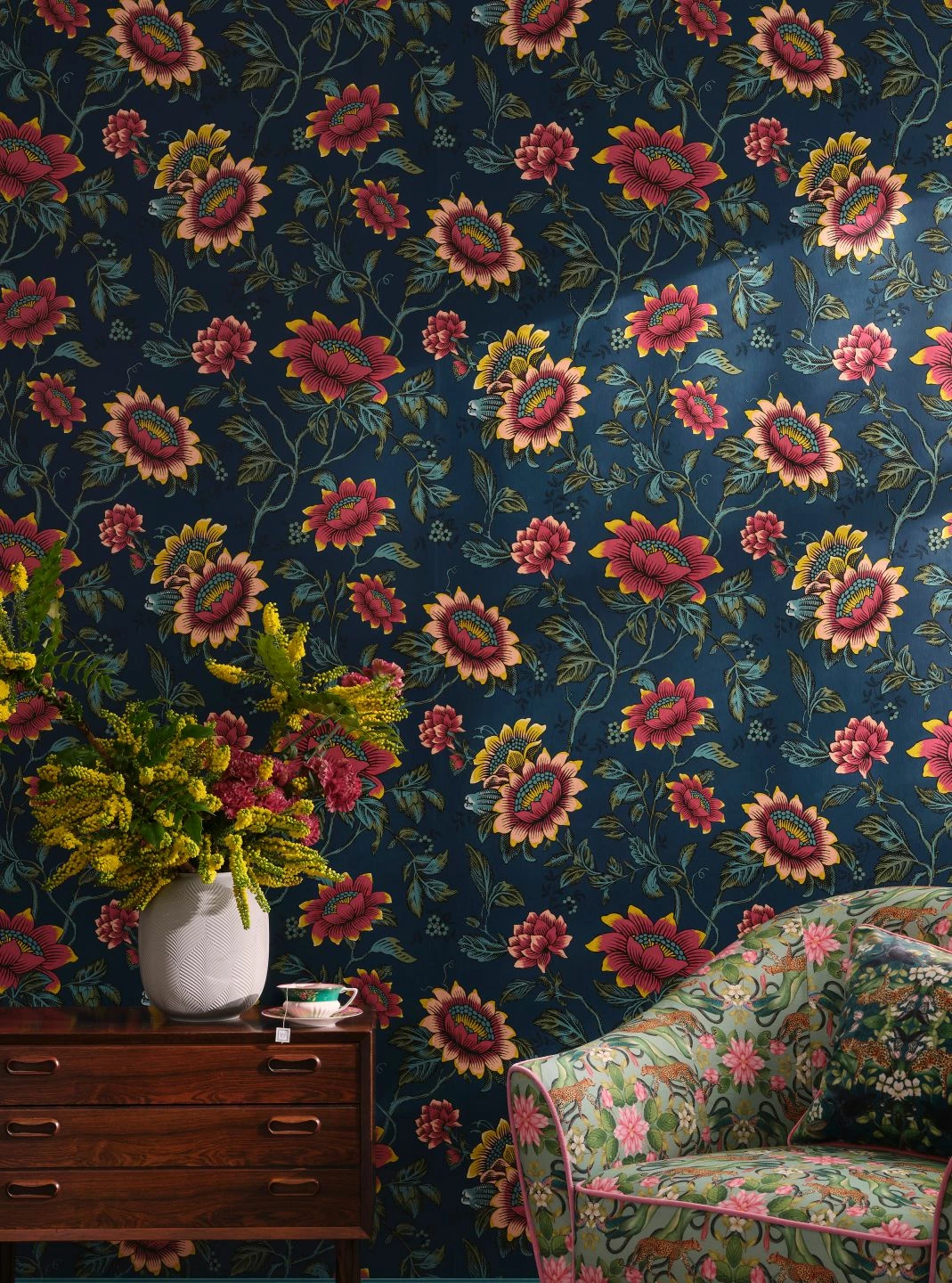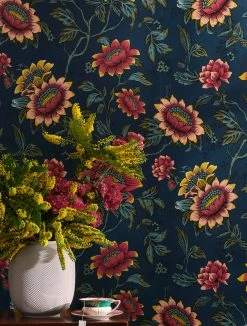 Große Blumen in kräftigem Rotviolett, Gelb und Türkisblau sind der Blickfang auf Vliestapete Tilla. Mit ihren ausdrucksstark gezeichneten, ausladenden Blüten leuchten sie auf dem tief dunkelblauen Grund eindrucksvoll. Farbauswahl und Zeichnung der Blüten und Blätter verströmen einen Hauch von heimeliger Nostalgie und schmücken Ihre Einrichtung im Landhaus- oder Vintage-Stil besonders wirkungsvoll.