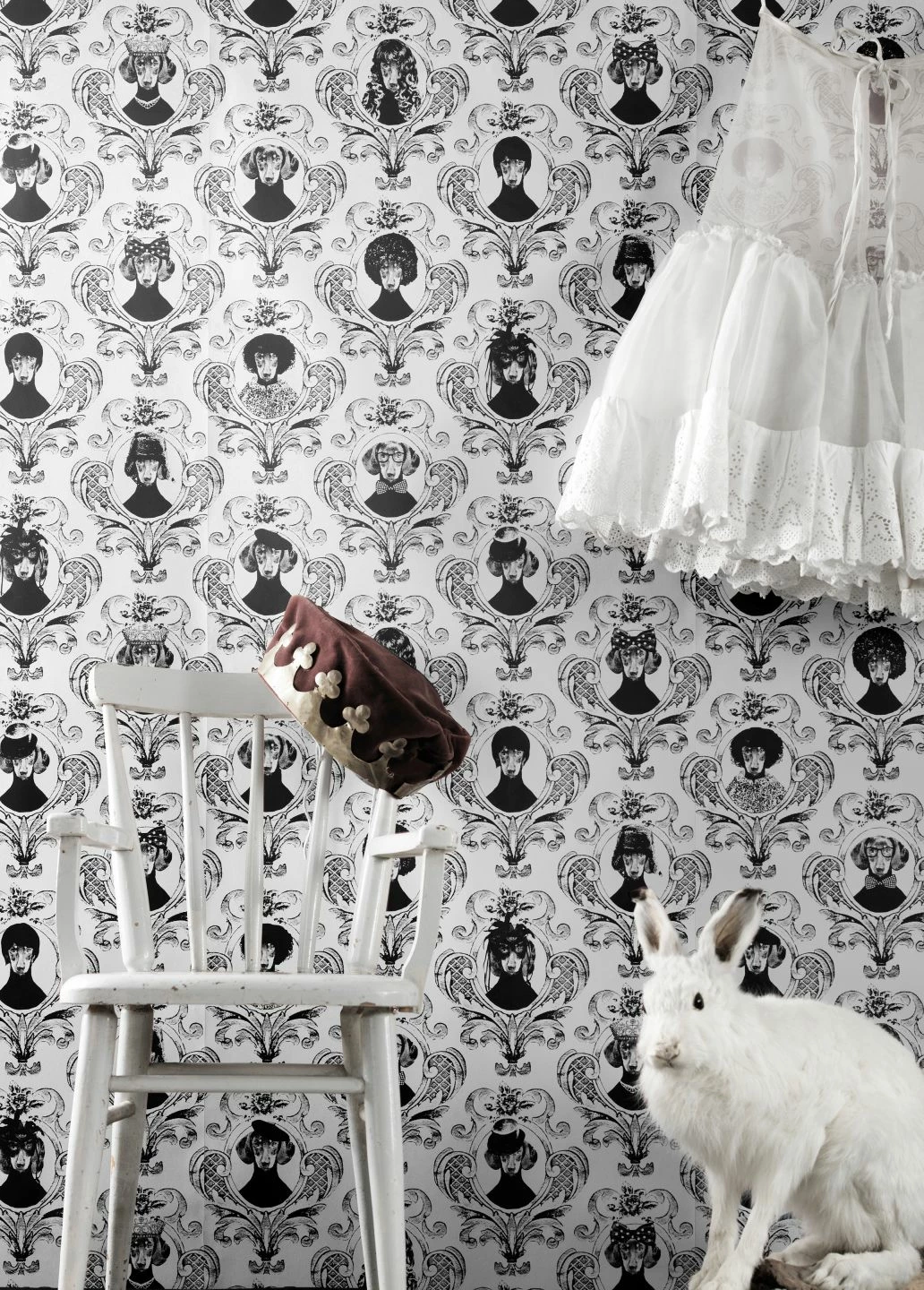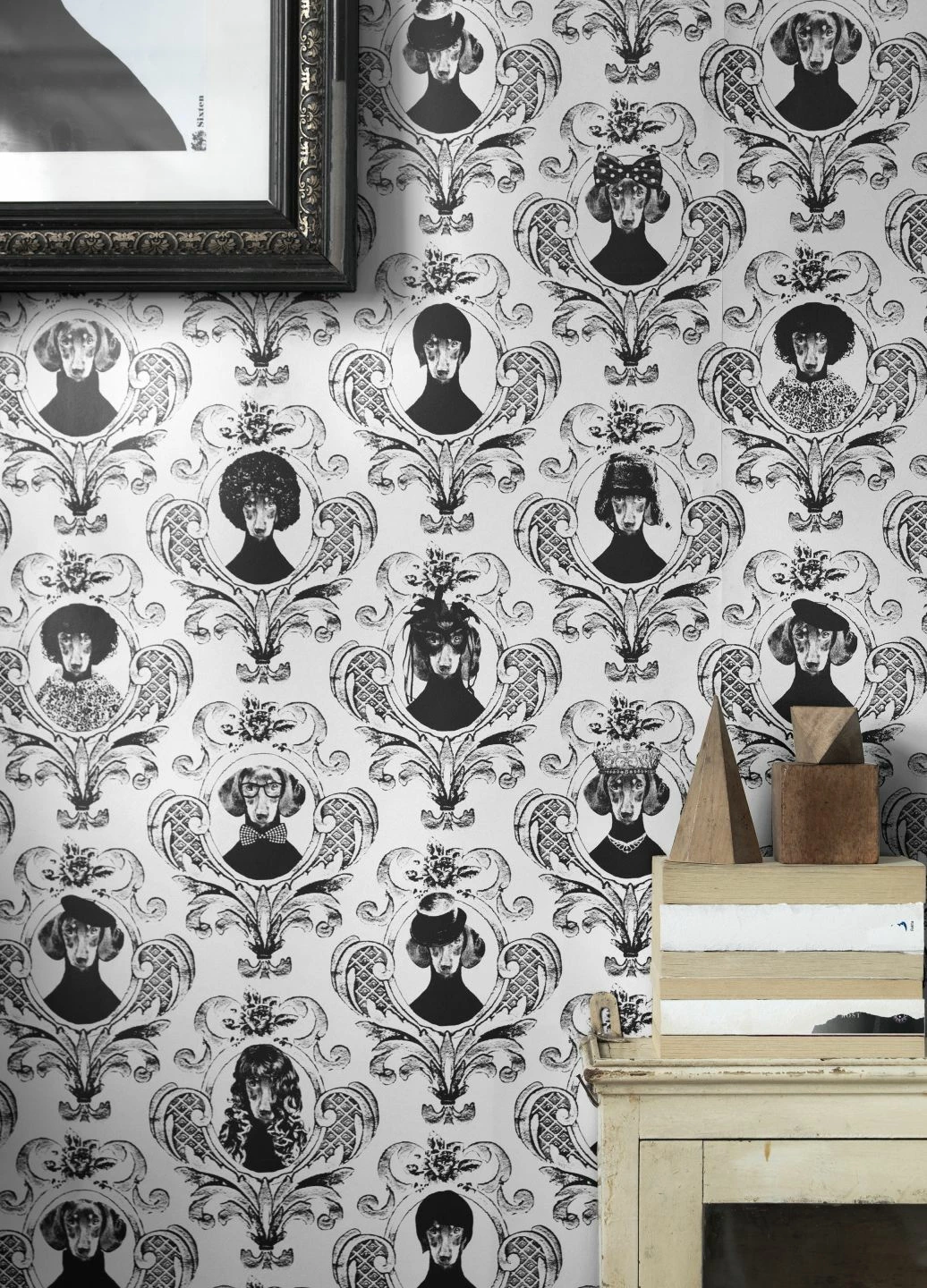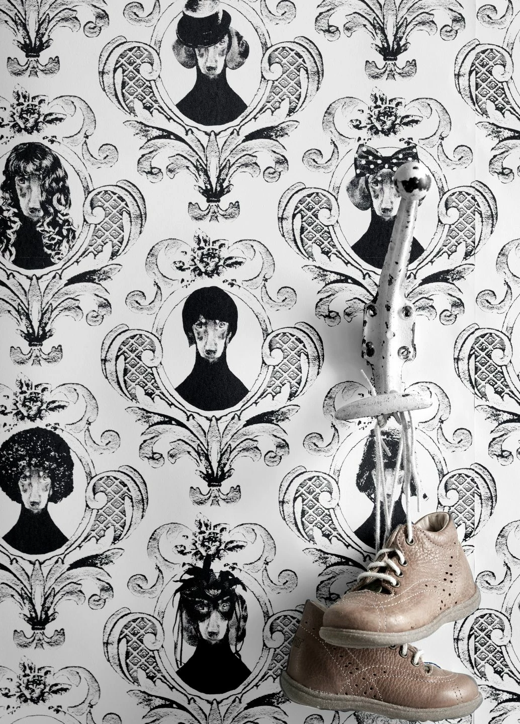 Die schwedische Designerin Lisa Bengtsson spielt geschickt und humorvoll mit unseren Sehgewohnheiten. Porträts nicht von Menschen, sondern von deren bestem Freund, dem Hund, sind ausgestattet mit sehr menschlichen Accessoires – von Perücken über Brillen bis hin zu Rollkragenpullovern. Wie Pressefotos vor der Ära der Digitalisierung sind sie in Graustufen gerastert und schlagen einen Bogen durch die Epochen zur traditionellen barocken Ornamentik klassischer Tapeten.