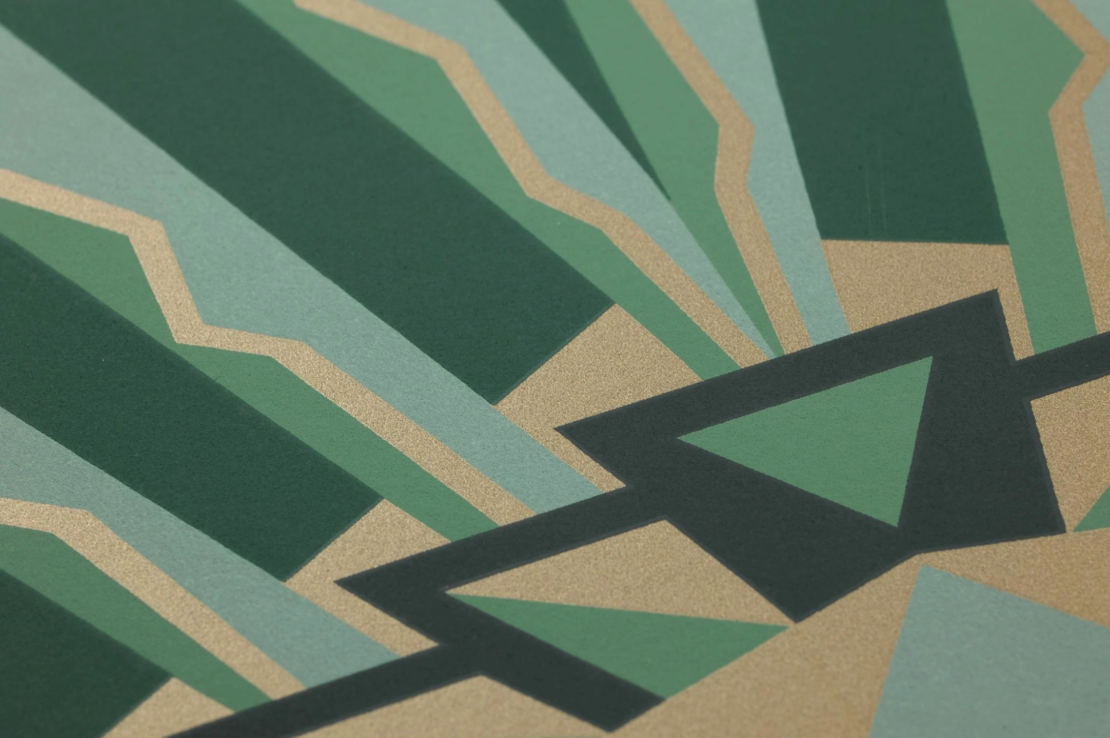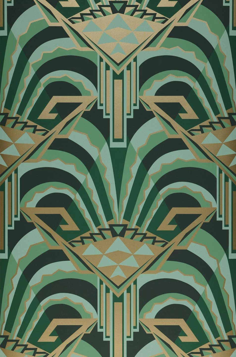 Jugendstil und Art Deco Motive leben von fantasievollen Elementen. Design Tapete Tonda reiht sich hier als moderne Variante ein und schlägt ungewohnt abstrakte Töne an. Die graphischen Elemente in Kieferngrün, Mattgold, Pastellgrün, Schwarzgrün erinnern an sprudelnde Wasserquellen und altägyptischen Pharaonenkult.
