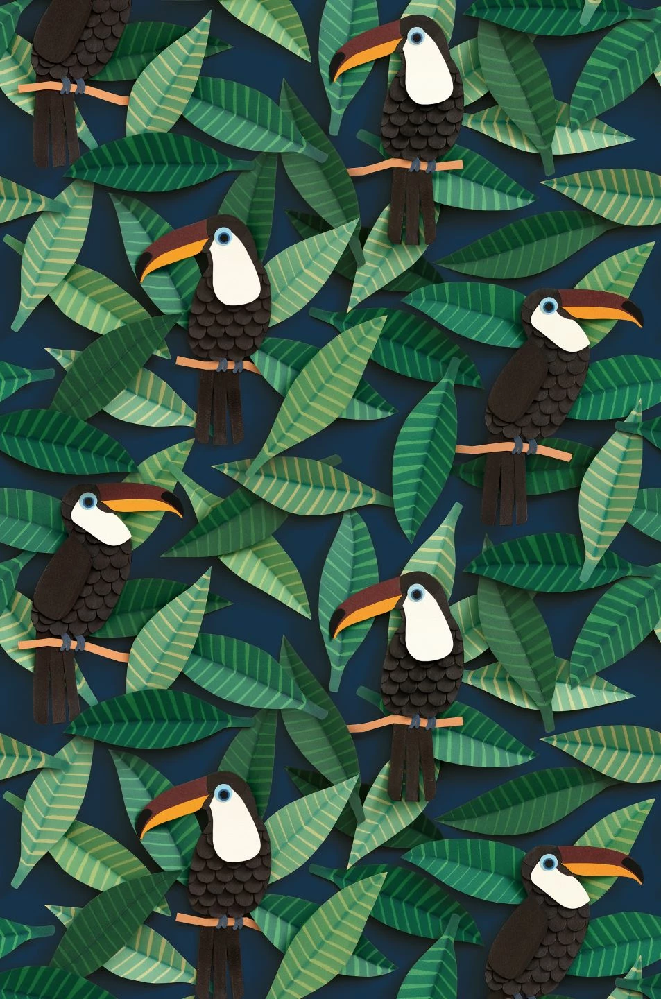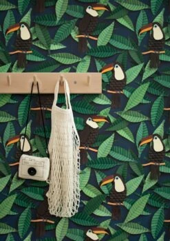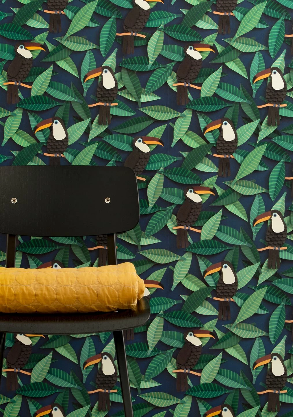 Wie aus Origamipapier gefaltet sehen die Tukane aus, die auf der Vliestapete vom Studio Ditte die dicht belaubten Zweige bevölkern. Ihre Federn und die exotischen, sich überlappenden Blätter sind so raffiniert mit Licht- und Schatteneffekten versehen, dass sie aus der Fläche der Wand dreidimensional hervorzutreten scheinen. Ein lebendiger, kindgerechter Wandschmuck für ein Kinderzimmer, in dem man sich wie mitten im Dschungel fühlt.