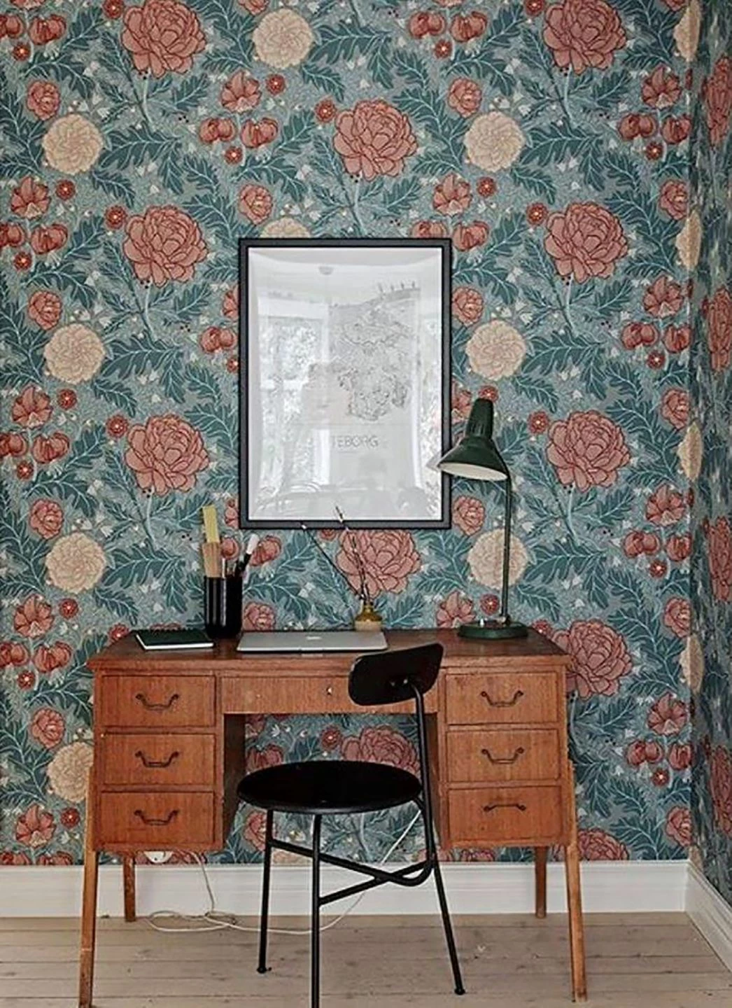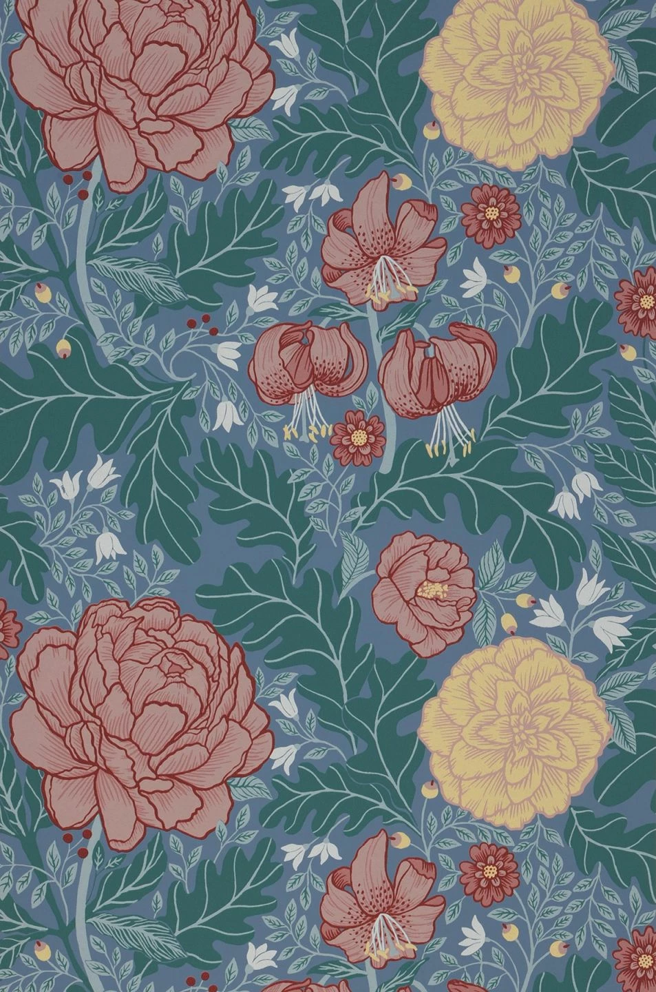 Große stilisierte Blumen mit rosafarbenen, braunrot umrandeten Blütenblättern scheinen aus dem Design herauszuragen. Gleichzeitig bleiben die blassgelben Blüten mit rosafarbenen Rändern ebenso wie kleinere Blumen, Blätter und Früchte weiter im Hintergrund. Aus dem Zusammenspiel der Farben, Formen und Größen mit dem taubenblauen Grund entsteht ein lebendiger, räumlicher Eindruck, der Ihr Zimmer optisch öffnet.
