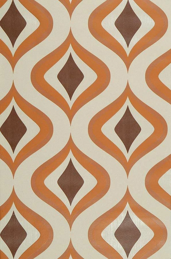 Das ausgeprägte Muster im Stil der 70er Jahre lässt an die geschwungenen, sich gegeneinander drehenden Formen eines vom Wind bewegten Mobiles denken. Die sanften, abgerundeten Rauten und Wellenlinien in Orange, Braun und Hellelfenbein, die als Relief in der Vinyloberfläche fühlbar sind, passen perfekt zu Möbeln im Retro-Stil. Die waschbeständige Tapete lässt sich sogar in Ihrem Bad stilvoll einsetzen.