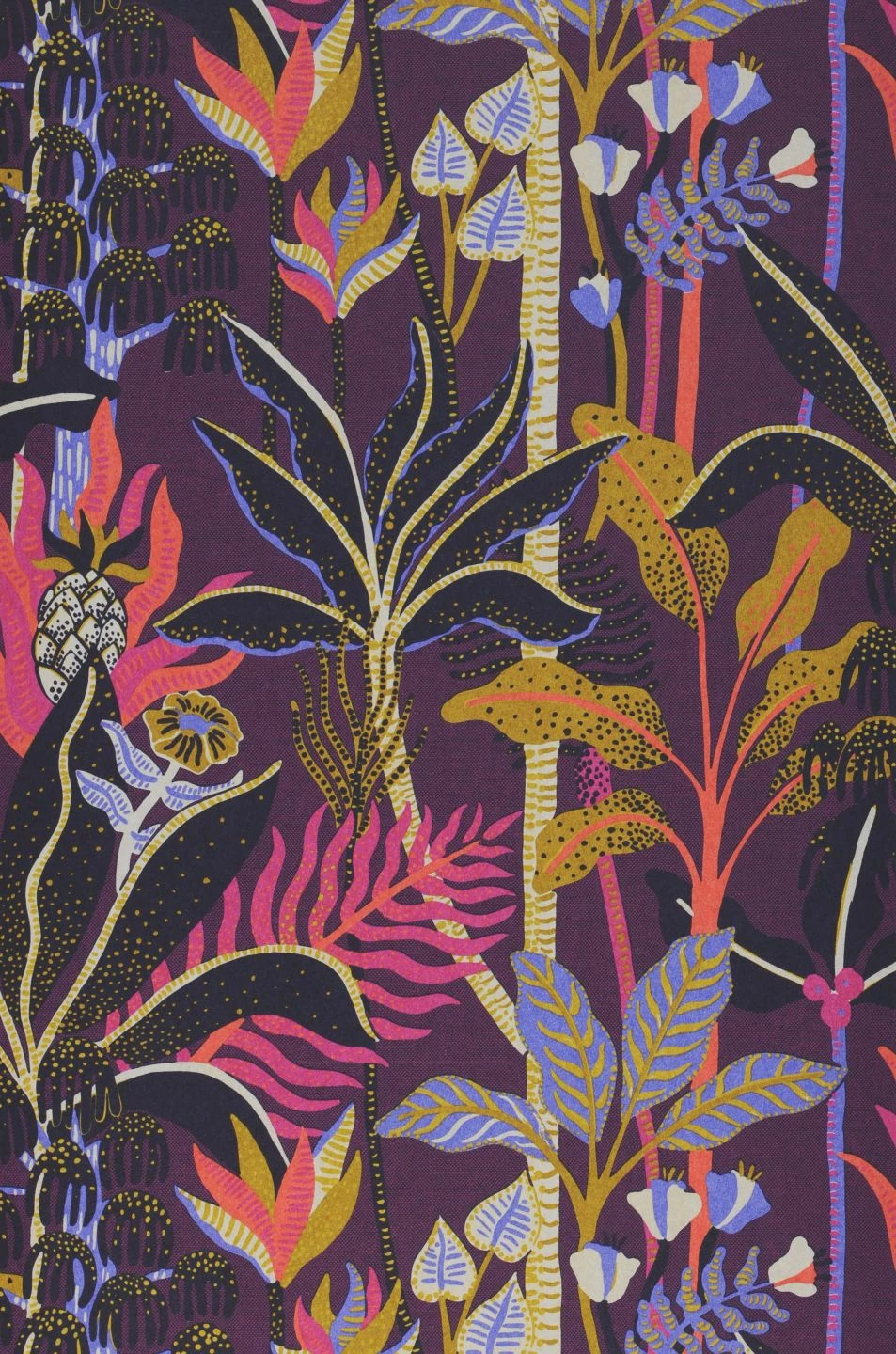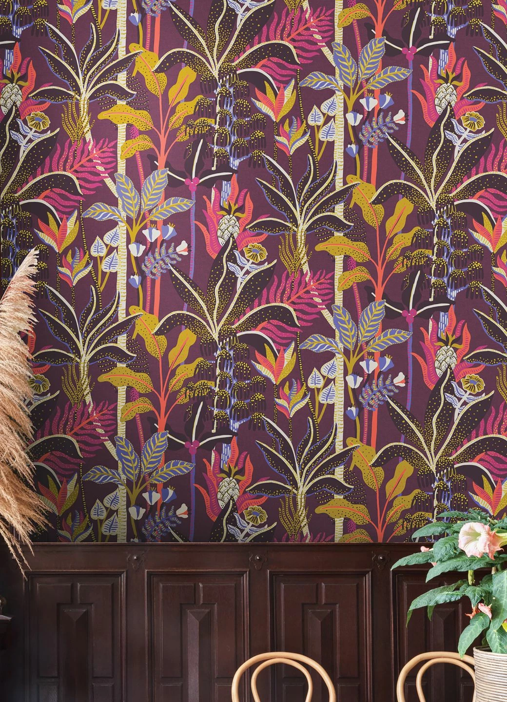 Eine fantastische Tropenwelt tut sich vor Ihren Augen auf. Die schlanken Stämme von Palmen mit ihren feinen Blattwedeln, exotische Pflanzen mit ausladenden, geäderten Blättern, Ranken und zarte Blüten ziehen Sie in einen Traum der Tropen hinein. Im Mittelpunkt der Vliestapete mit ihrer modernen Interpretation eines botanischen Musters stehen sommerlich-fruchtige Violett-Töne und leuchtendes Currygelb.