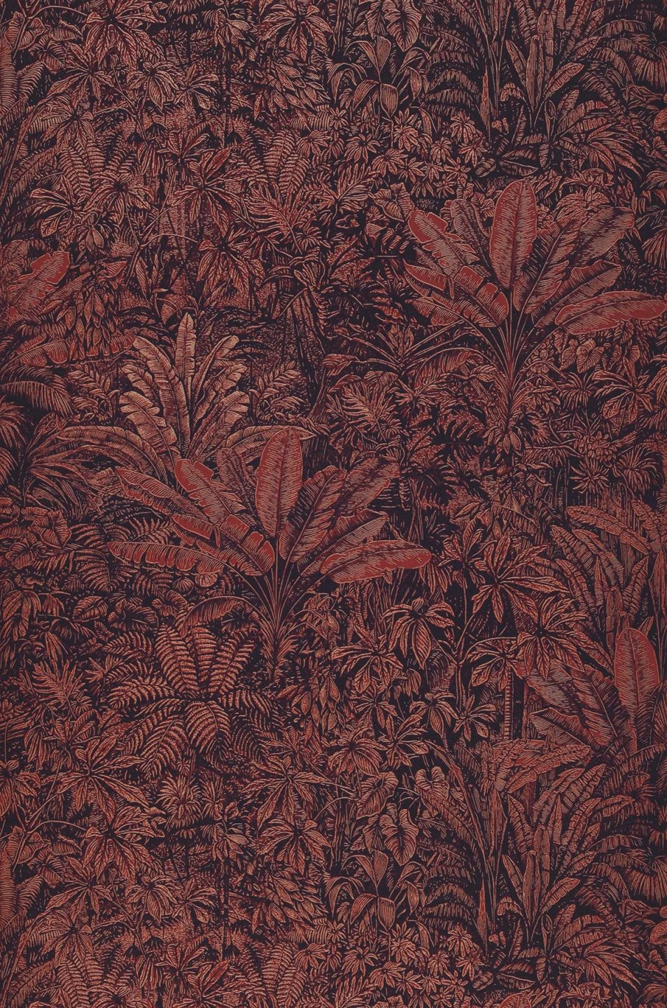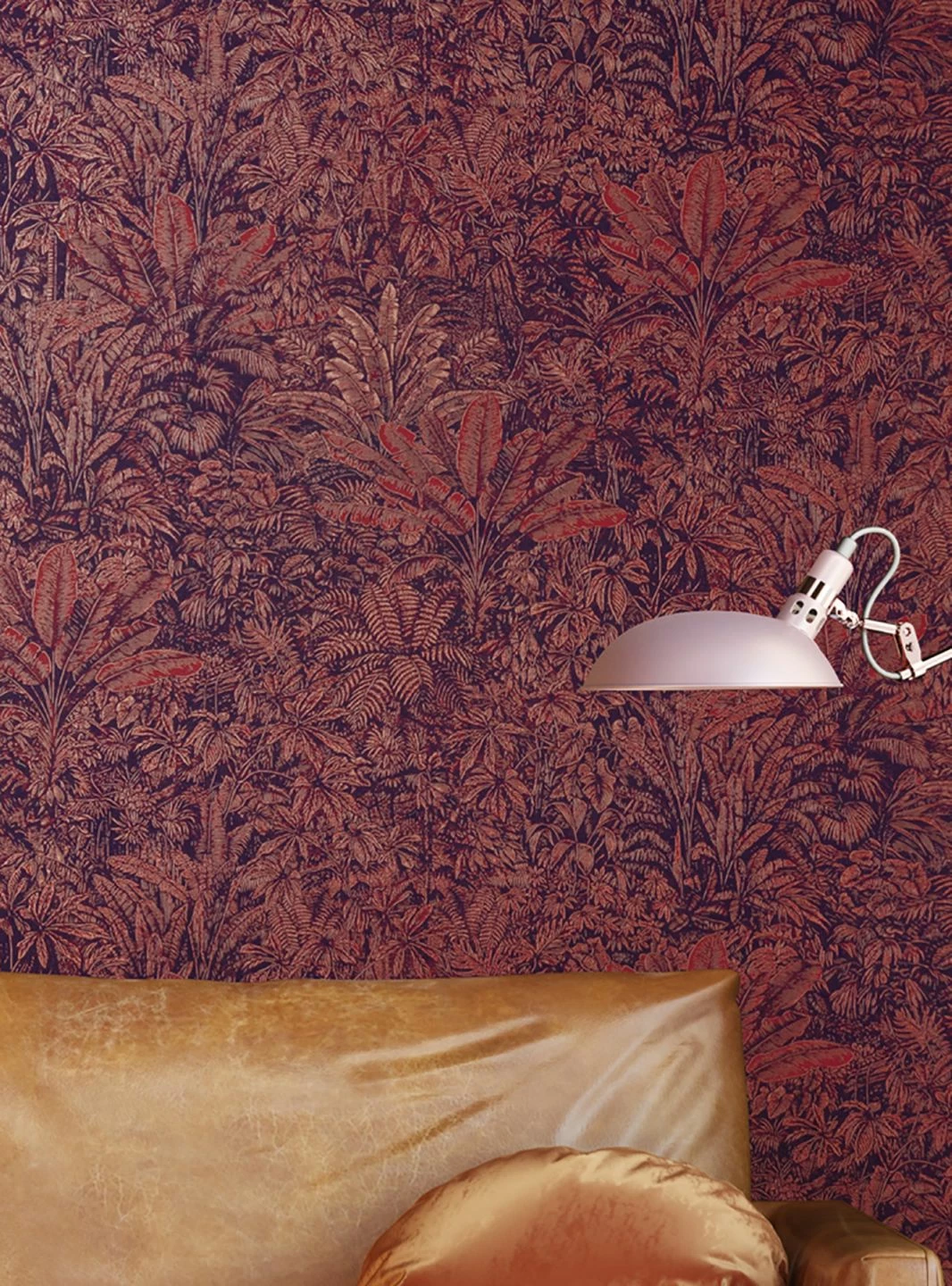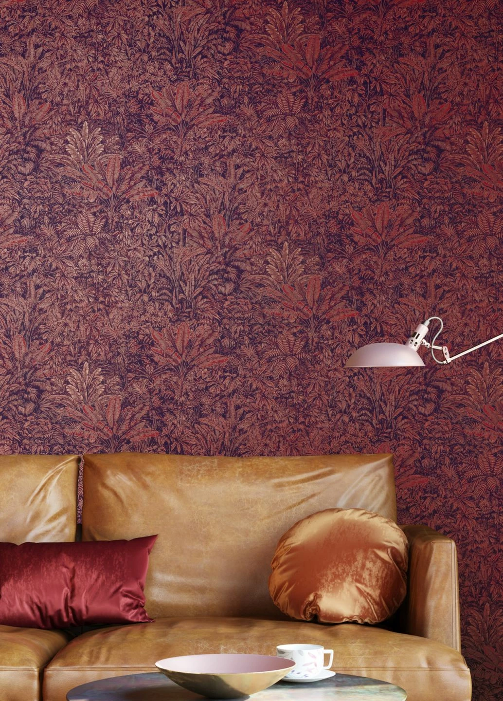 Die Darstellung tropischer Farne und Palmwedel mit ihren filigran verästelten Blättern auf dieser Vliestapete lebt von einem Detailreichtum, der seinesgleichen sucht. Wie in einem undurchdringlichen Dschungel wachsen sie dicht an dicht. Die Zeichnung der Blätter und Palmwedel erinnert an einen Kupferstich. Warme Rot-, Braun- und Beigetöne schaffen eine behagliche Atmosphäre mit einer Portion Exotik.