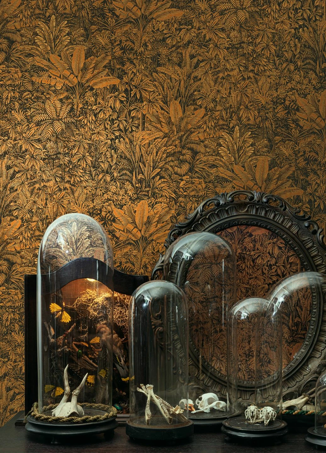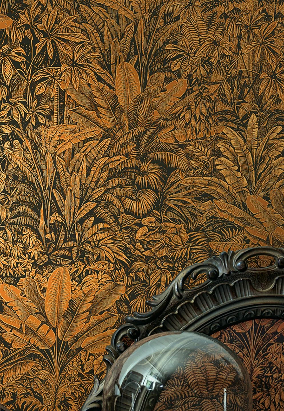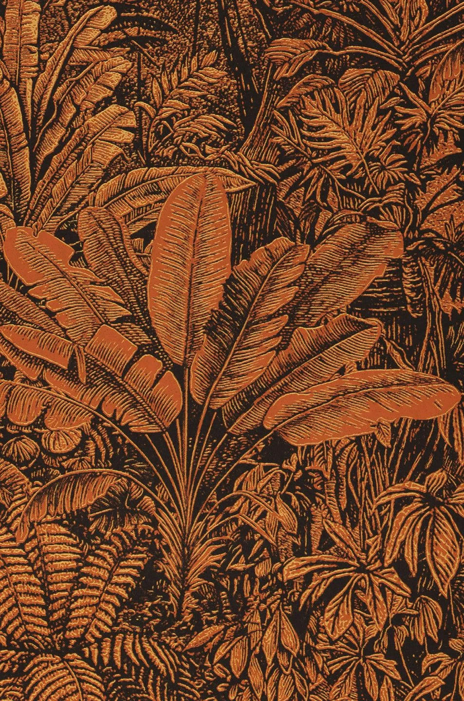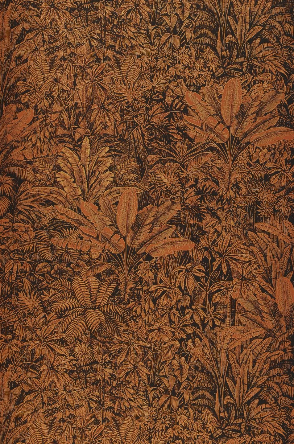 Schier undurchdringlich ist das Pflanzendickicht, das sich wie ein tropischer Dschungel über die Tapete zieht. Tropische Farne, Palmwedel und Blätter geben die ganze Vielfalt exotischer Vegetation wieder. Besonders edel wird die Tapete durch ihre Farbgebung: Mattes Gold und warmes Orangebraun erzeugen einen golden-bronzenen Schimmer und verleihen Ihrem Raum eine unvergleichliche Stimmung.
