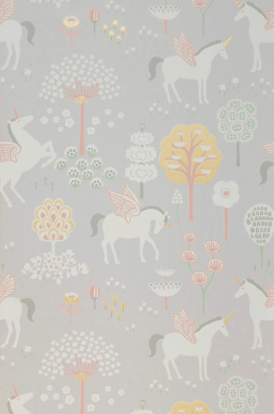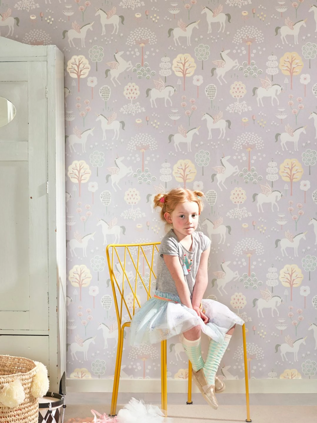 Komm mit ins Land der Einhörner – Die schwedische Tapetenmanufaktur Majvillan hat ein pastelliges Traumland erschaffen, in der die beliebten Fabelwesen der Kinderwelt zum Eintauchen einladen. Die hellgraue Grundfarbe der waschbeständigen Vliestapete verbindet sich magisch mit den Musterelementen in Cremeweiß, Grün, Rosenholz und Goldgelb Schimmer.