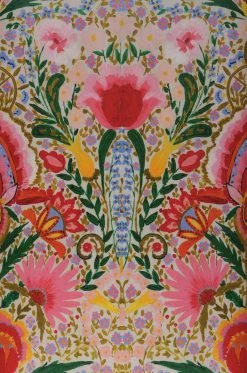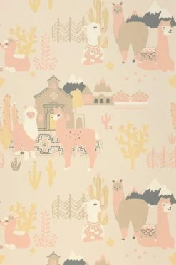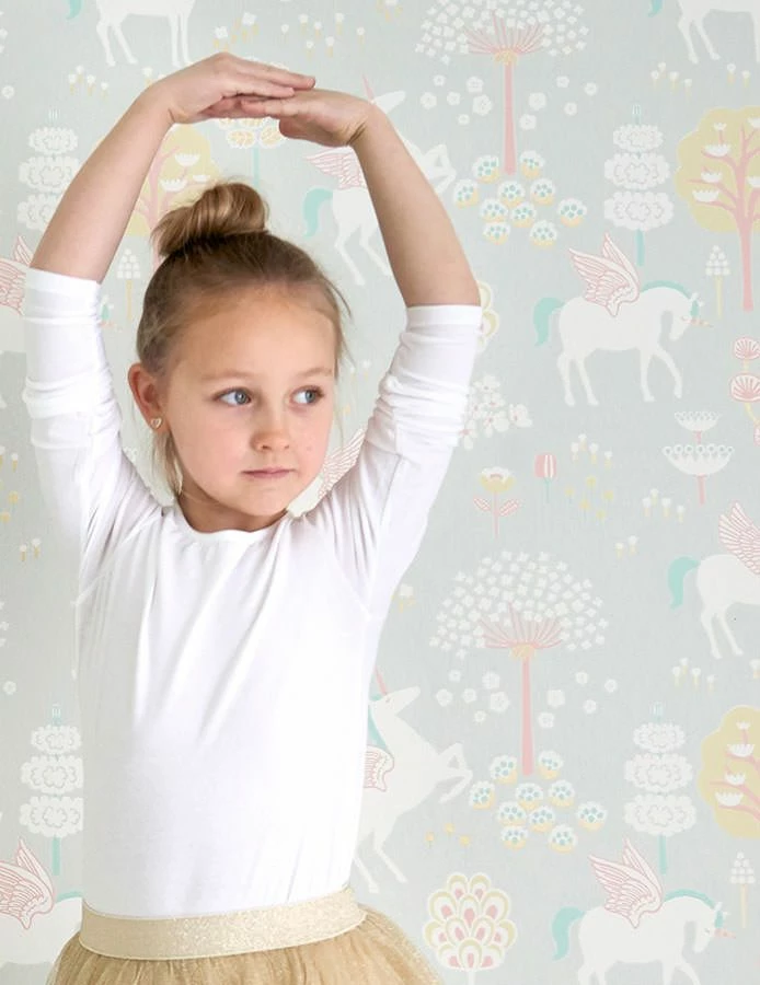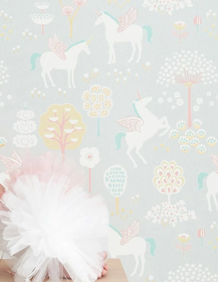 Musterelemente in Altrosa, Cremeweiss, Hellgelb, Pastellgrün und Ocker Schimmer auf feinem Hellgrau ermöglichen Entspannung, Einhorn-Fantasy mit Happy End und beflügelnde Inspiration. Die waschbeständige Kindertapete von Majvillan ist ein herrlicher Wandstoff aus dem Mädchenträume gemacht werden.