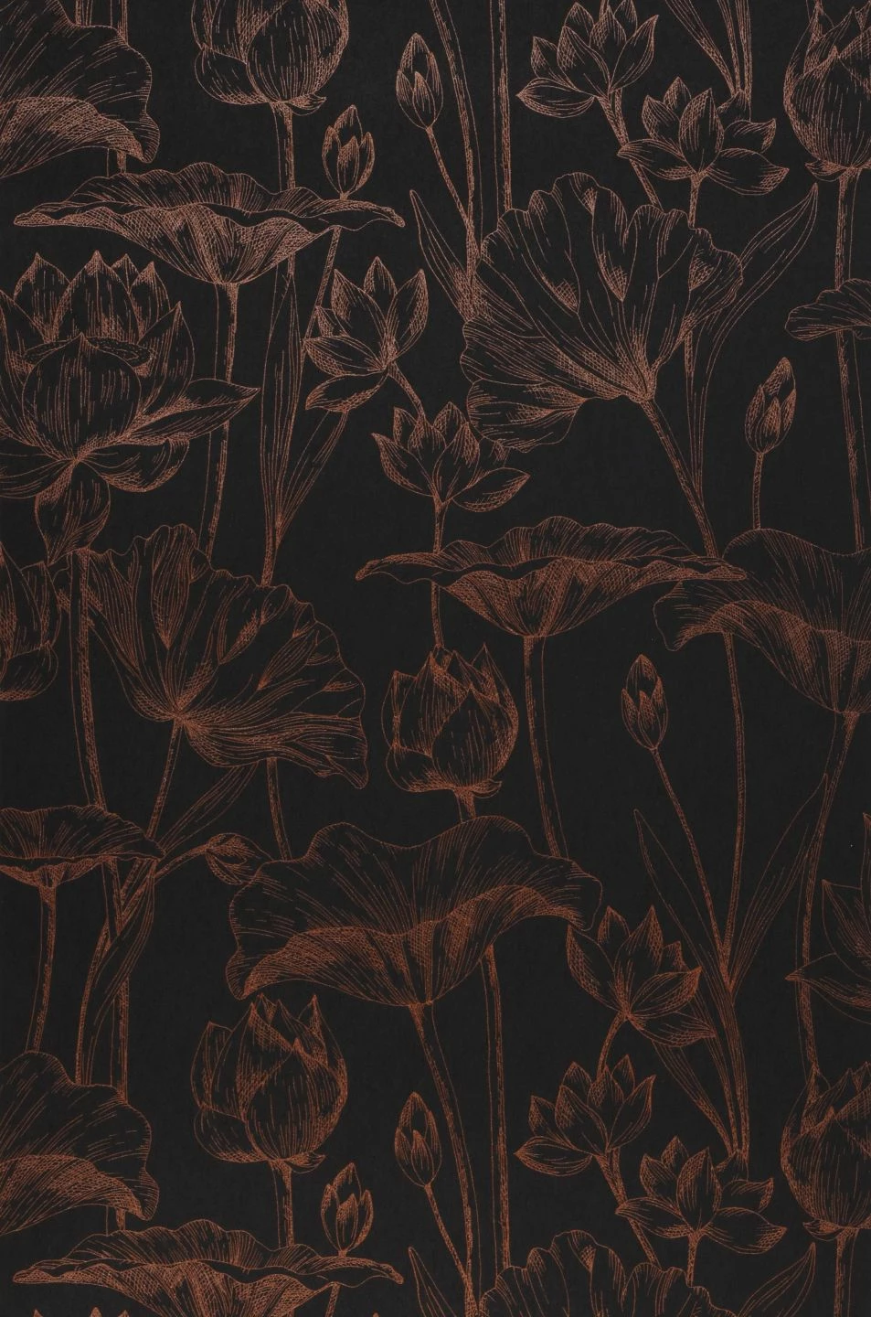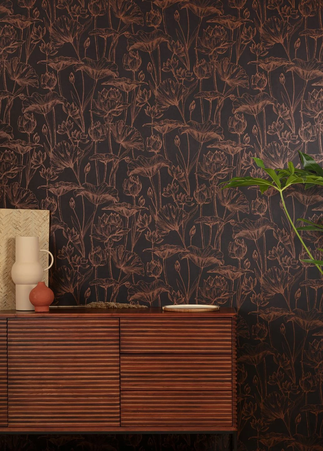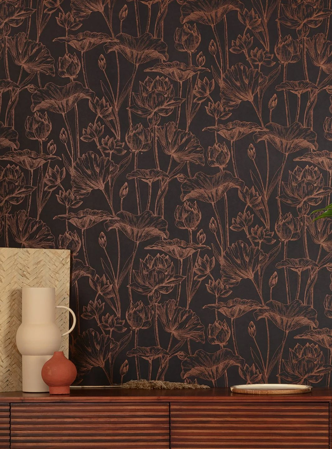 Auf dem schwarzbraunen Grund scheinen die Lotosblumen, deren imposante Blüten und kräftige Blätter nur durch zarte, leicht schimmernde Linien in Perlkupfer und Silberglitzer angedeutet sind, beinahe zu glühen. Umbra gibt der Themenwelt Orient eine geheimnisvolle ästhetische Note und macht Ihren Raum zu einem Märchenreich. Sorgsam gewählte Einrichtungsstücke in den Kupfertönen des Musters komplettieren den sagenhaften Look.