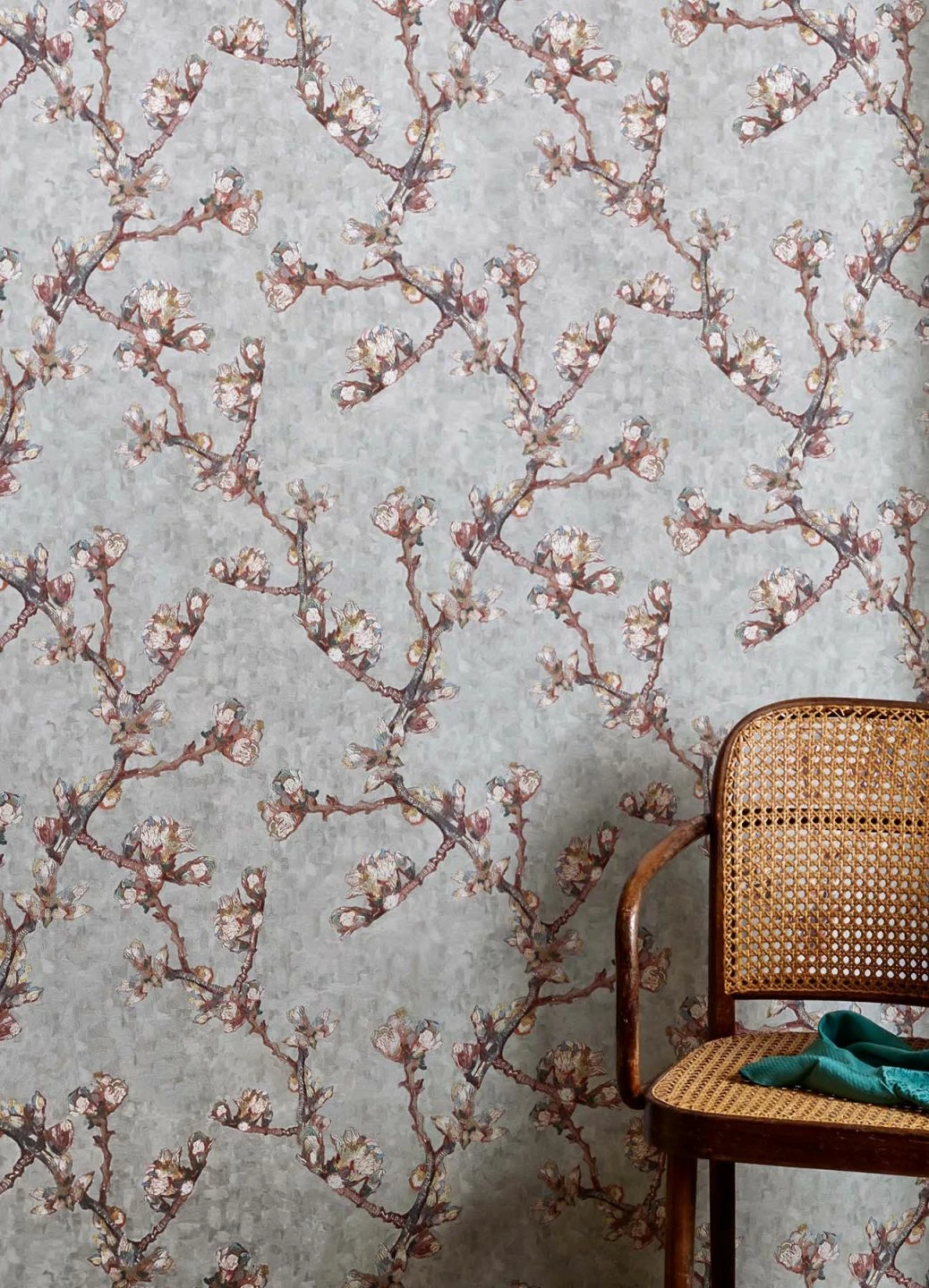 Die blühenden Zweige außer Rand und Band – Auf dem grauen Hintergrund entwickelt das Naturschauspiel eine recht rasante Eigendynamik, die in alle Richtungen ausschlägt. Wachstum wird auch durch die feine Strukturierung der Tapetenoberfläche sichtbar, die an die Kraft der Pinselführung erinnert.
