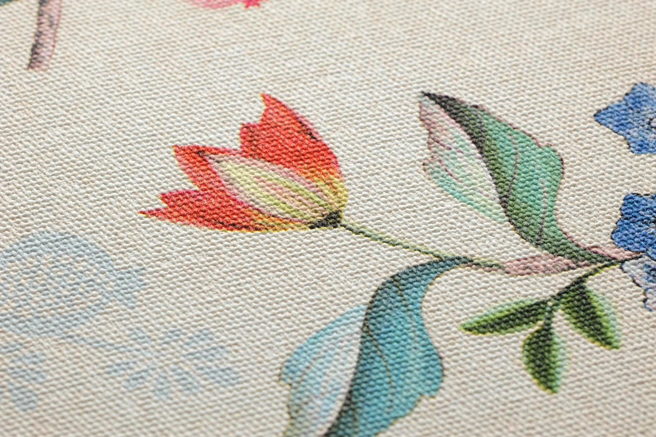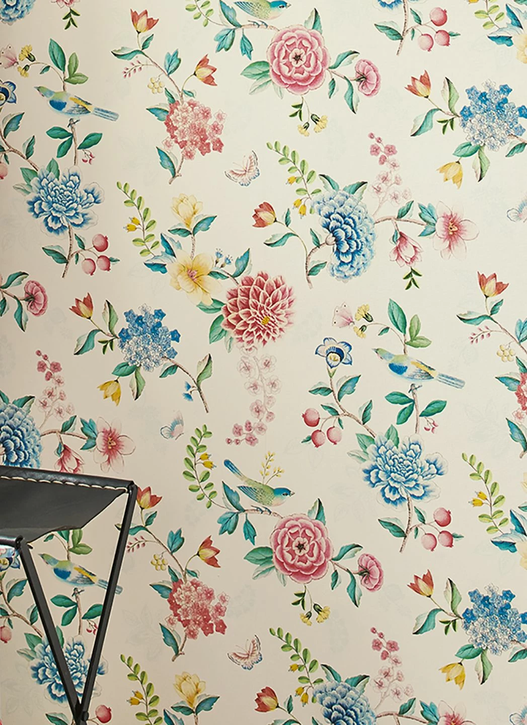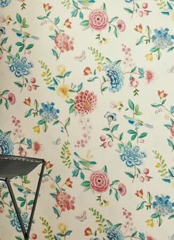 Frische Farben, die Leichtigkeit einer Sommerwiese voller Blüten und Schmetterlinge, dazwischen bunte Vögel und in zartem Hellblau angedeutete Silhouetten von Blumen – die Vliestapete strahlt Lebensfreude und sommerliche Wärme aus. Die Oberfläche besteht aus Vinyl, das die Farben leuchten lässt und eine spürbare Struktur wie ein textiles Gewebe aufweist. Das Material ist waschbeständig und eignet sich für jeden Raum – sogar für Ihr Badezimmer.