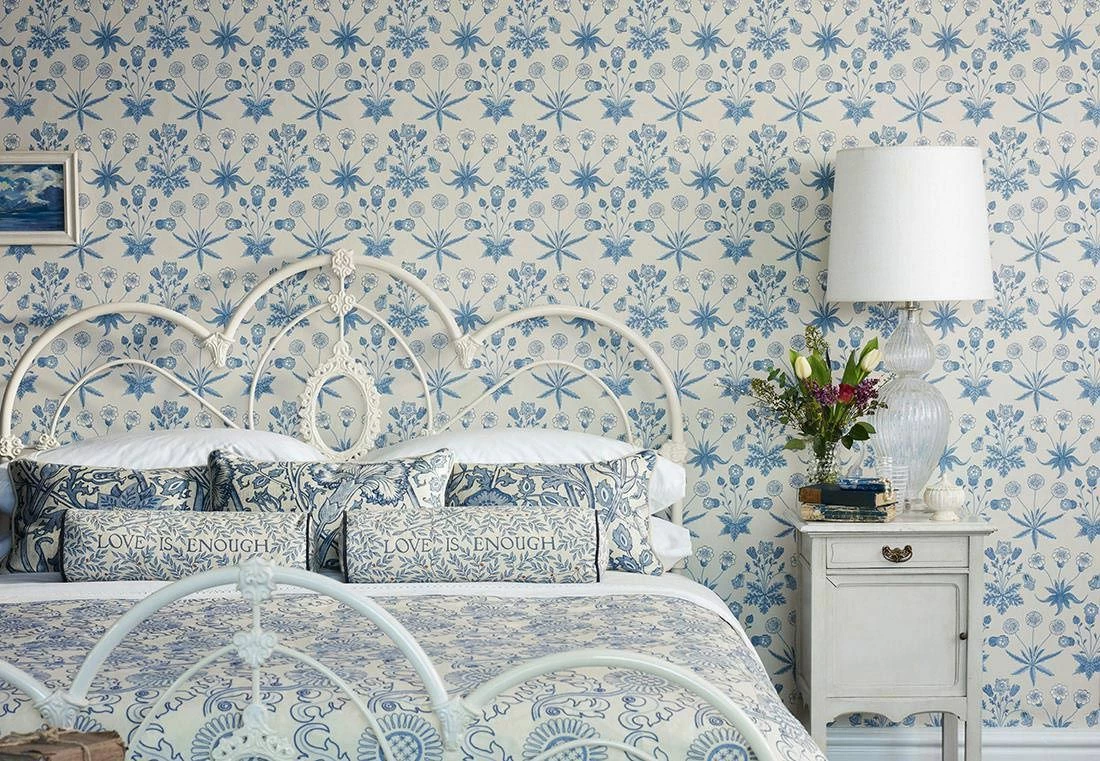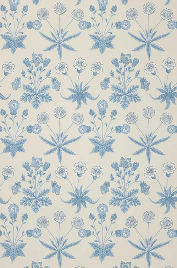 Das Blumendesign dieser klassischen englischen Tapete ist der erste Entwurf des englischen Designers und Künstlers William Morris, der von Morris & Co. produziert wurde. Kleine stilisierte Blümchen in zwei verschiedenen Blautönen und Weiß auf cremeweißem Grund sind in ordentlichen Reihen arrangiert. Mit „Vatea“ haben Sie die Wahl: Ein duftiges Schlafzimmer schmücken Sie damit ebenso effektvoll wie eine Küche im Landhausstil oder ein Wohnzimmer mit antiken englischen Möbeln.