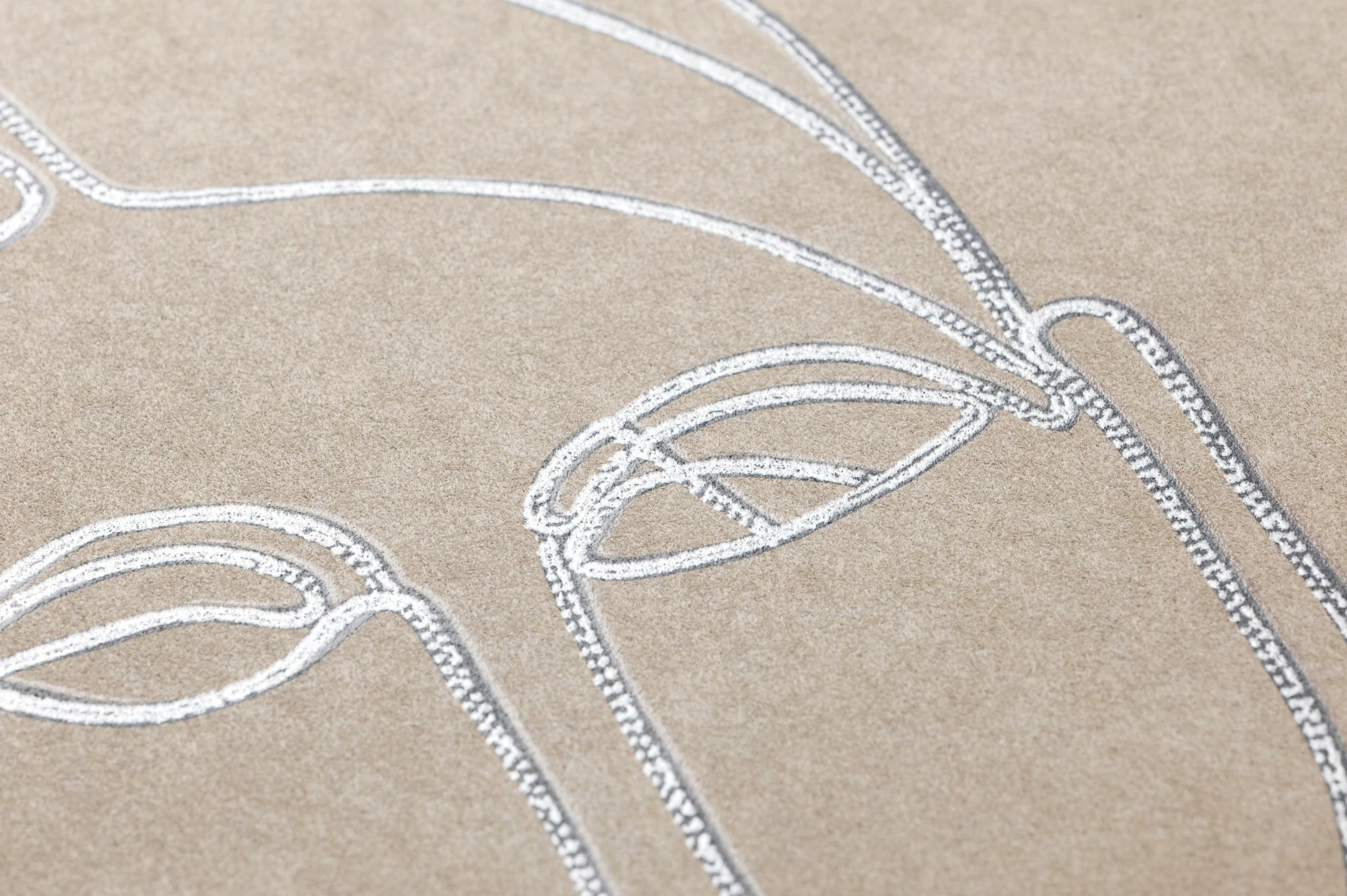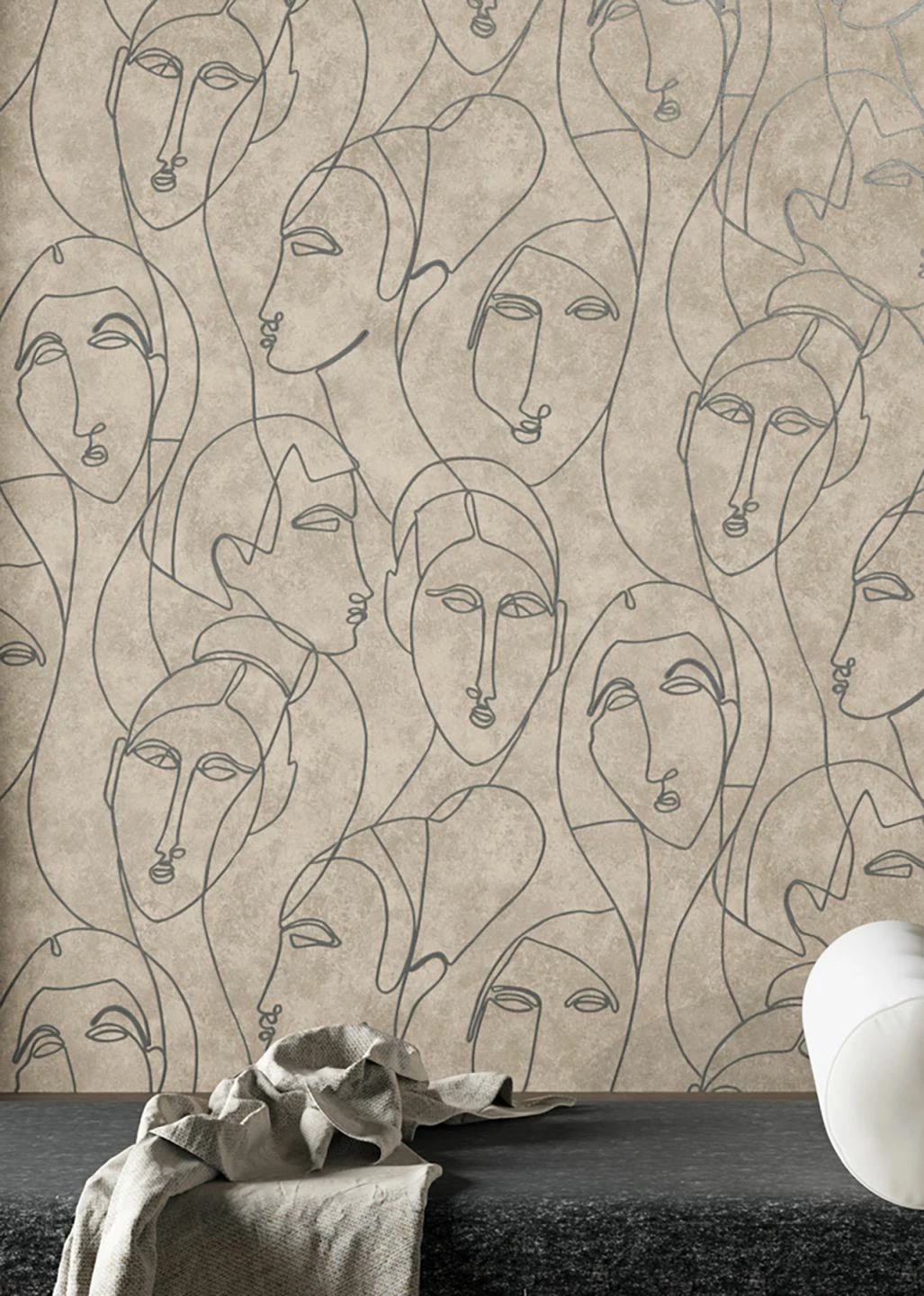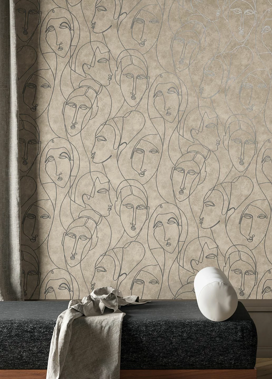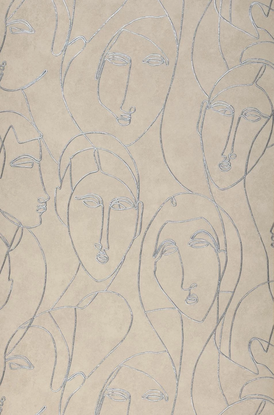 Aus den verschlungenen, leicht schimmernden, dunkel- und silbergrauen Linien, die sich über die graubeigefarbene Grundfläche der Vliestapete winden, entstehen stilisierte und gleichzeitig ausdrucksstarke Gesichter. Der Eindruck einer angedeuteten Menschenmenge belebt Ihre Wände auf kunstvolle Weise. Durch die leichten Farbschattierungen im Graubeige des Untergrunds gewinnt die Tapete zusätzliche Struktur.