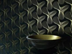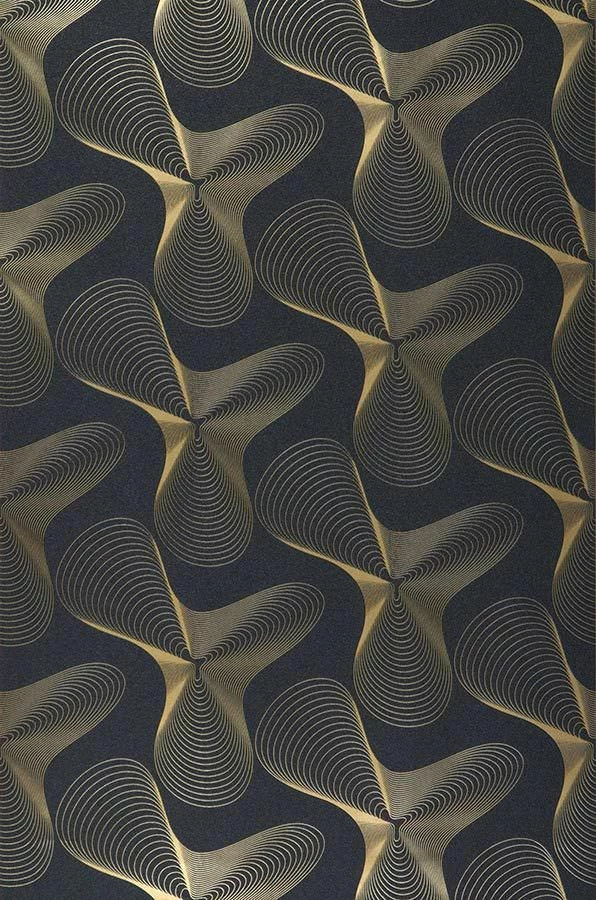 Goldene Spiralen auf dunklem Untergrund versetzen uns in Schwingung, denn das bewegte Linienspiel erzeugt eine besondere Perspektive für Zeit und Raum. Ein Meisterwerk von Design Karim Rashid.