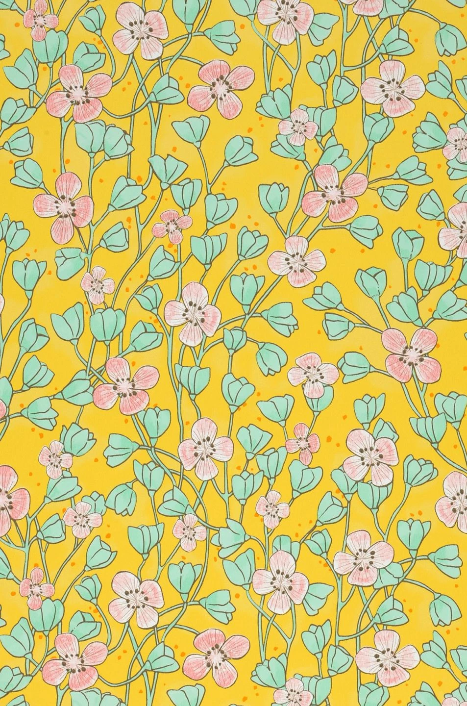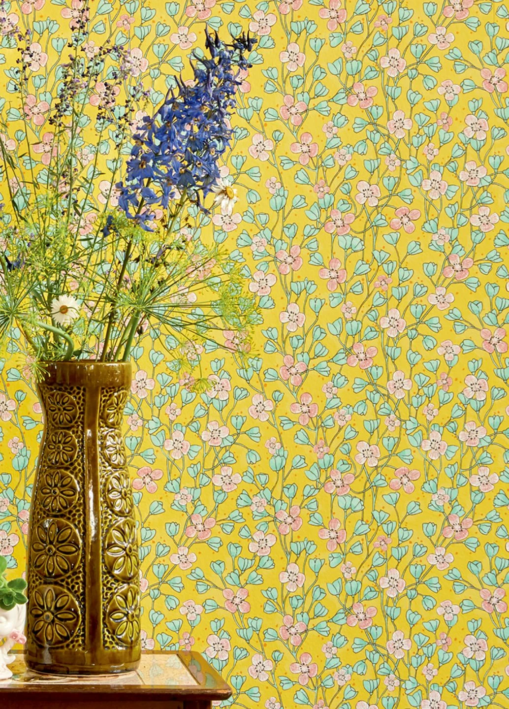Sonniges Gelb gesprenkelt mit orangefarbenen Punkten leuchtet zwischen den zarten Blumenranken auf dieser Vliestapete hervor. Die von Altrosa bis ins Weiße spielenden Blüten und die pastellgrünen Blattranken stellen der leuchtenden Grundfarbe ein sanftes Gegengewicht zur Seite. Die fröhlichen Farben der Tapete betonen das Sonnenlicht in Ihrem Raum und schaffen eine Atmosphäre der Lebensfreude und des Frühlings.