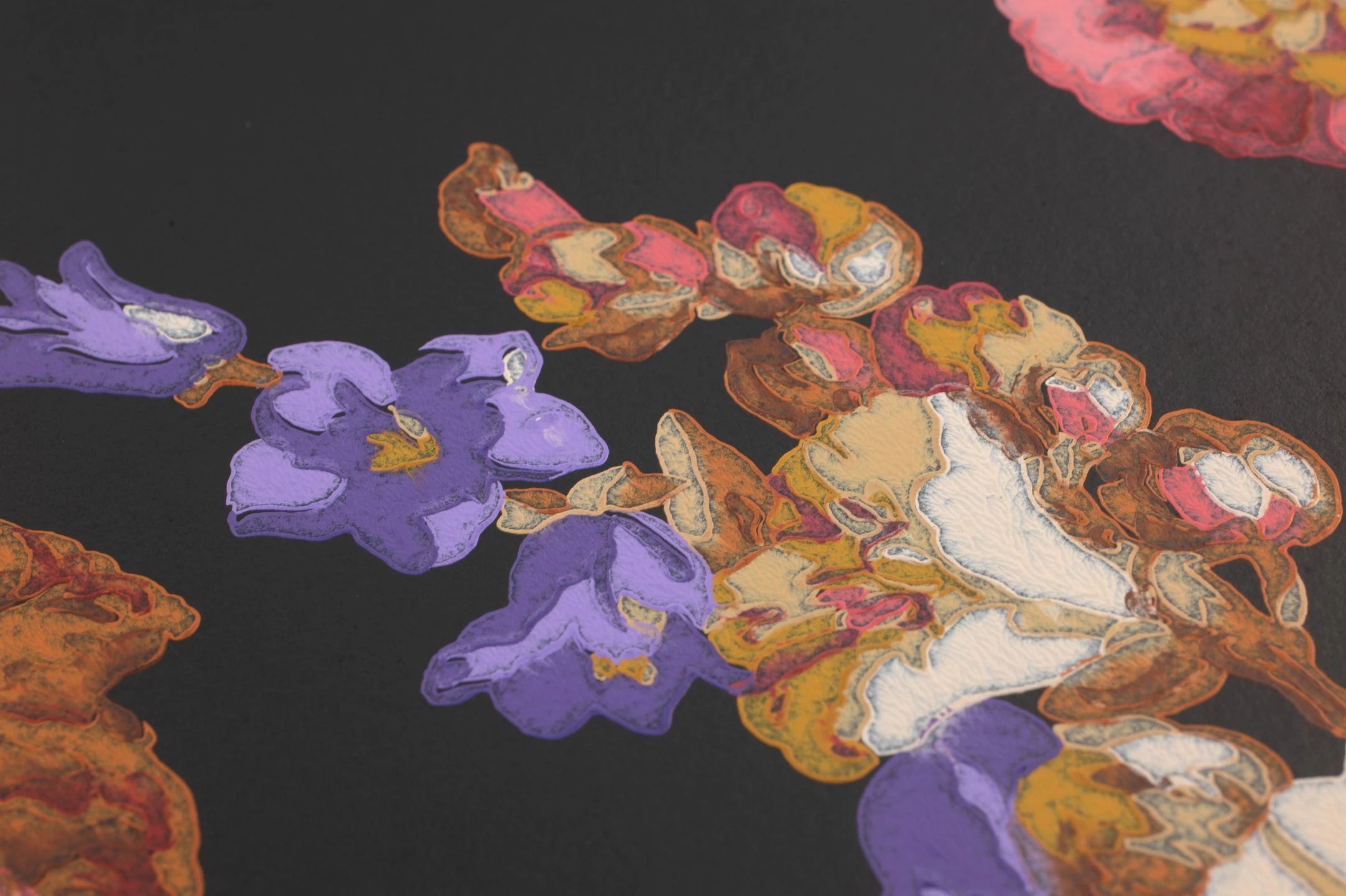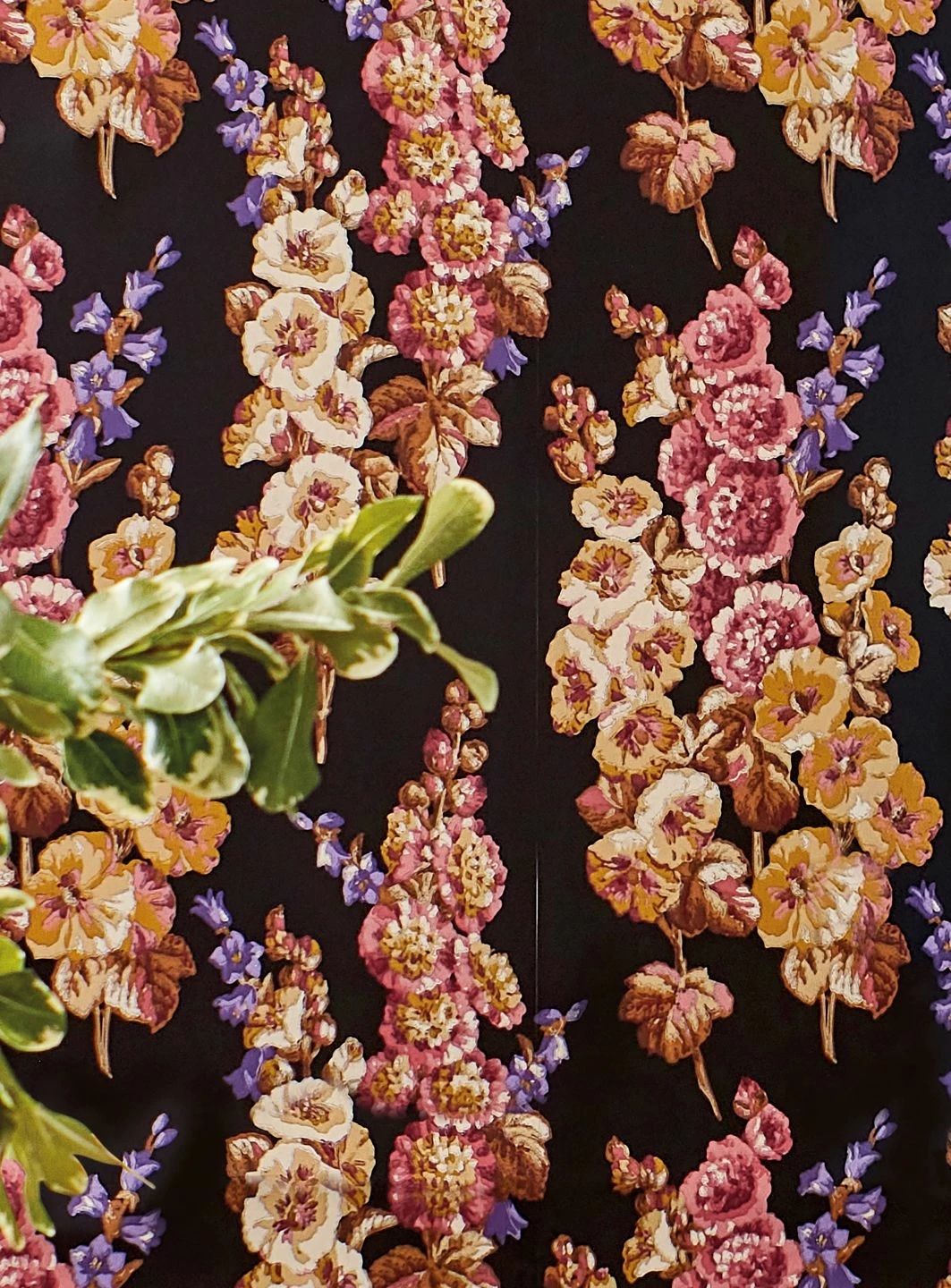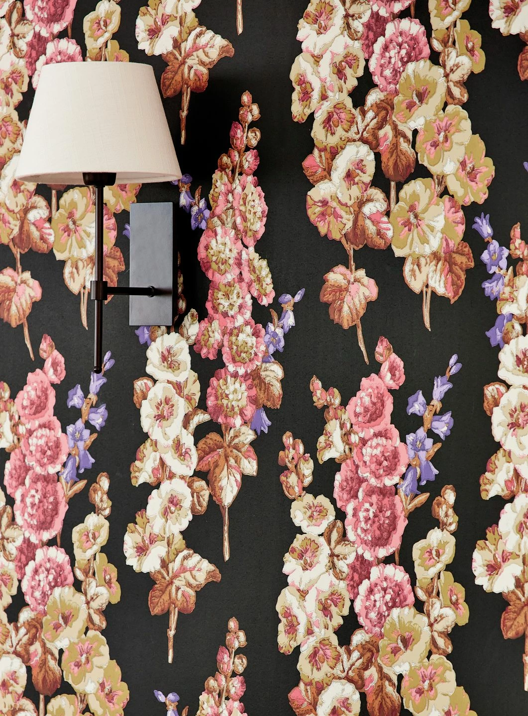 Die schwarze Grundfarbe dieser außergewöhnlichen floralen Tapete lenkt die ganze Aufmerksamkeit auf die leuchtenden Farben der Stockrosen, aus denen sich das elegante Muster zusammensetzt. Die kräftigen Rosa-, Violett-, Gelb- und Beigetöne scheinen auf dem dunklen Grund eine ganz eigene Leuchtkraft zu entwickeln. Besonders kostbar wirkt die Tapete durch das verwendete Leimdruckverfahren, das den Farbauftrag wie handgefertigt erscheinen lässt.