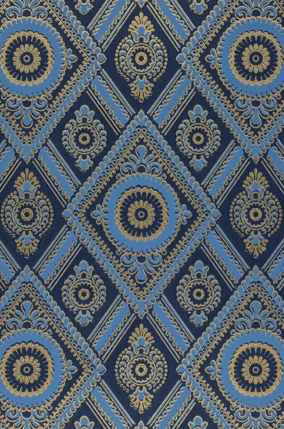 Designtapete William in Kobaltblau, Brillantblau und Gold berührt die Seele mit ihrer unvergleichlichen Schönheit. Kostbar, königlich und eindrücklich präsentiert sich das historisch-geometrische Muster im Stil der britischen Renaissance. Gestalten Sie damit Ihren individuellen blauen Salon!