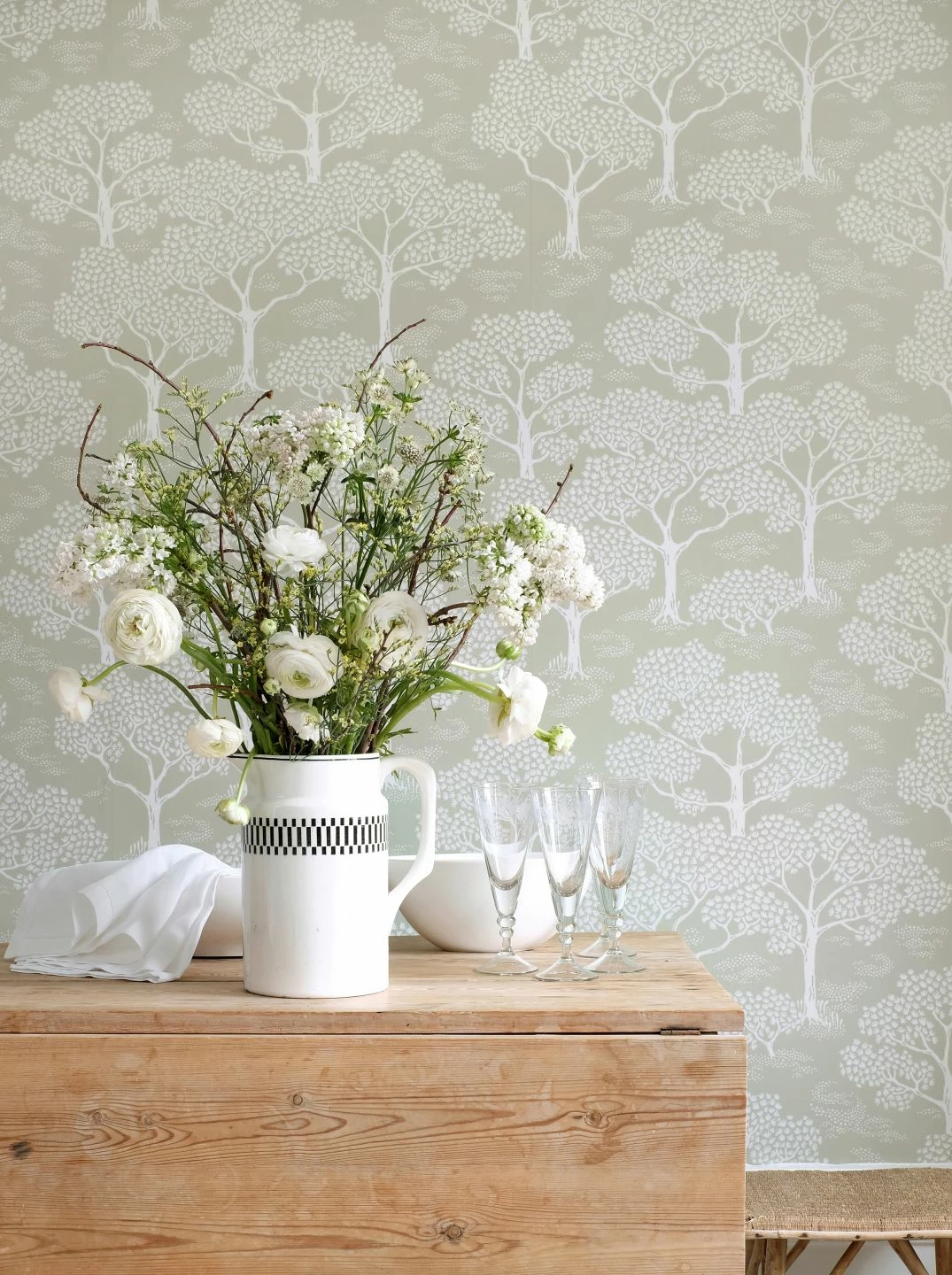 Ein lieblicher, frühlingshafter Laubwald, der Waldboden übersät von weißen Blütentupfen wie in der Blütezeit der Buschwindröschen – Woodland erinnert an einen erholsamen Waldspaziergang im Frühjahr. Das helle Schilfgrün und das Cremeweiß des Musters finden sich zusammen zu einer zurückhaltenden, aber dennoch präsenten Ästhetik, mit der Sie Ihre Küche, Ihr Schlafzimmer oder auch Ihr Büro wirkungsvoll dekorieren.