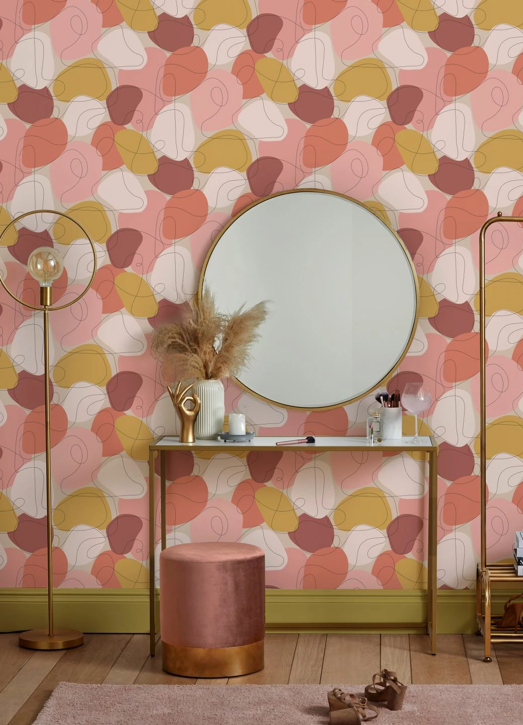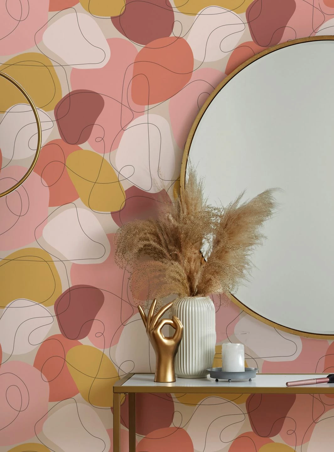 Belebend und Energie spendend sind die Rottöne und das Senfgelb, die den lebhaften Charakter der ausdrucksstarken Tapete bestimmen. Unregelmäßig geformte Farbflächen und wie zufällig hingekritzelte geschwungene Linien erinnern an die abstrakte Darstellung sommerlich blühender Blumen. Das Design, das die unbekümmerte Pop Art der 60-er Jahre zum Leben erweckt, passt prima zu Vintage-Möbeln mit den geschwungenen Konturen der Flower-Power-Ära.