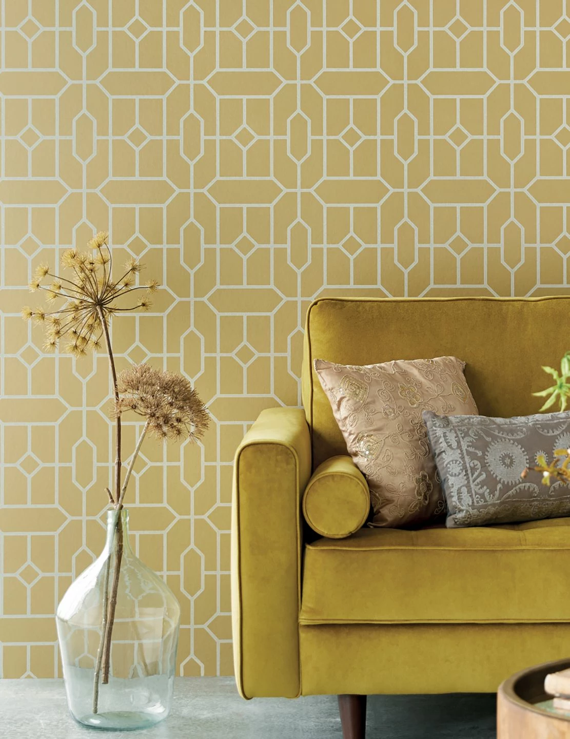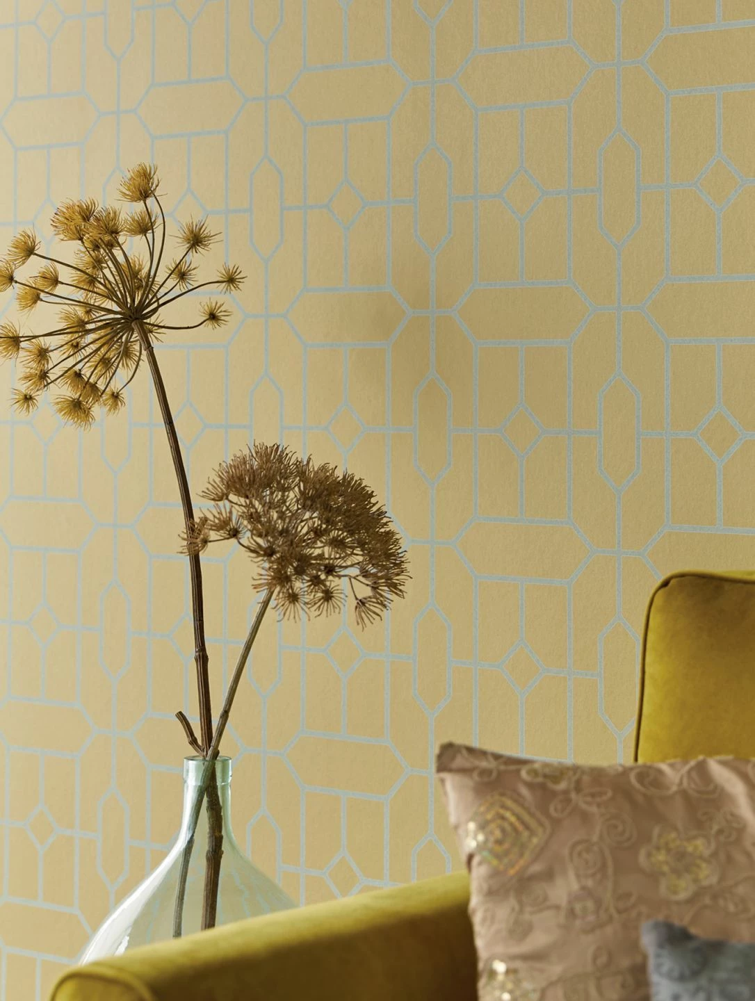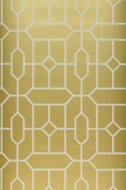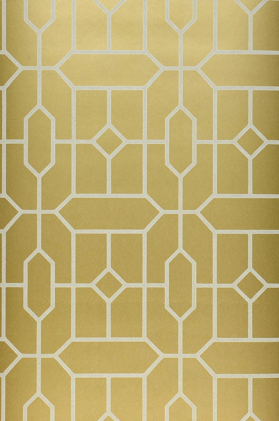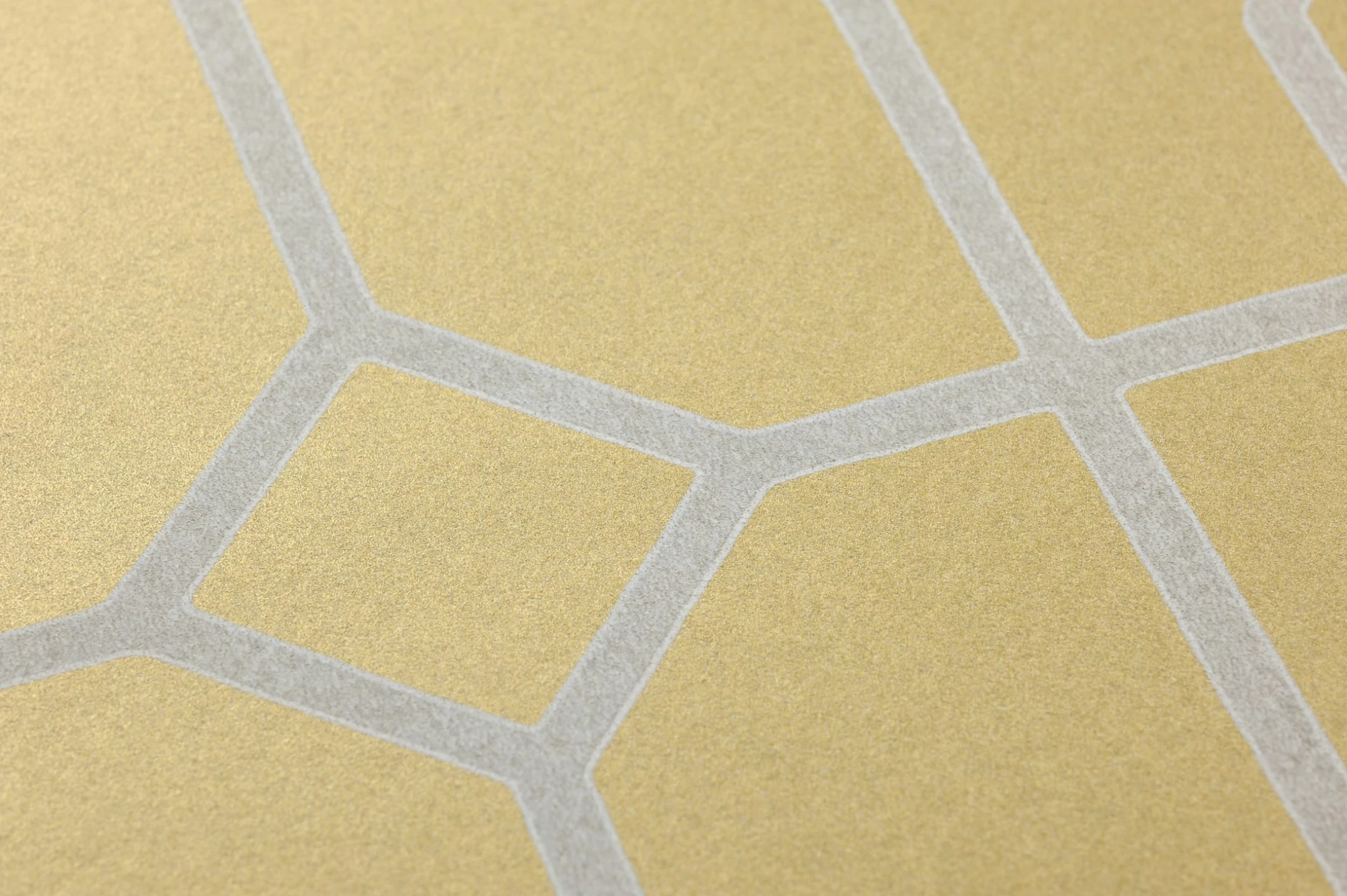 Das geometrisch fein verzweigte Formenspiel von Hexagon und Raute setzt in Gold und Grauweiss und mit schimmerndem Effekt neue Maßstäbe. Noch nie waren Glamour und Geometrie so kontrastreich vereint. Aus jedem Blickwinkel ergeben sich fantastische Perspektiven, die durch Licht zusätzliche tiefgründige Facetten ausbilden.