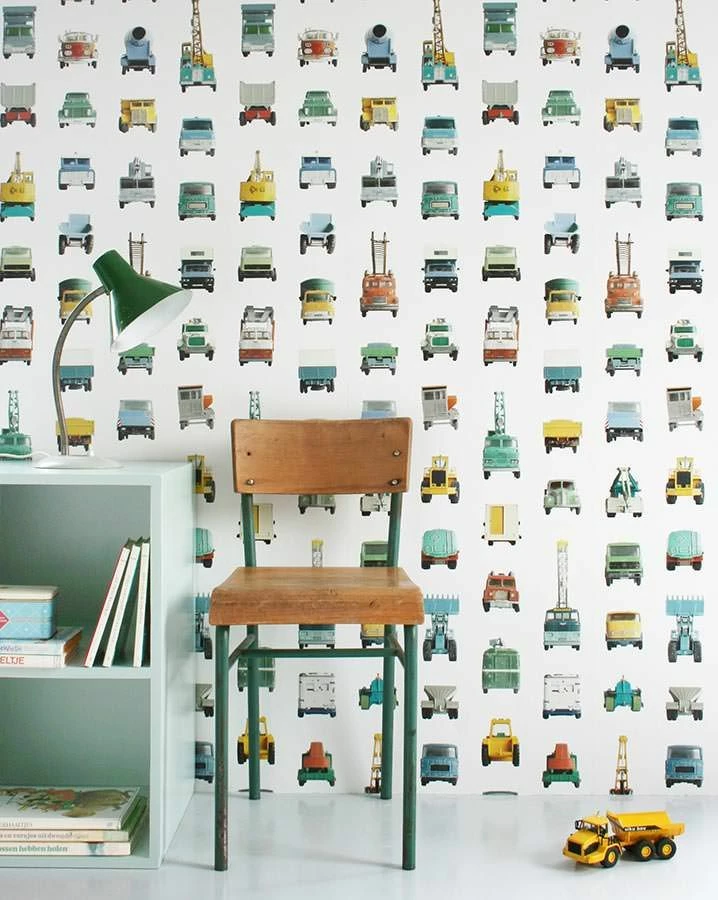 Lastwagen, diverse Transportfahrzeuge, Kran und Hebebühne, sogar ein Feuerwehrauto aus der guten alten Zeit haben ihren gebührenden Platz auf dieser nostalgischen Tapete gefunden. Zum Lernen oder einfach nur Bewundern ist die hochwertige Vliestapete von Studio Ditte gleichermaßen geeignet.