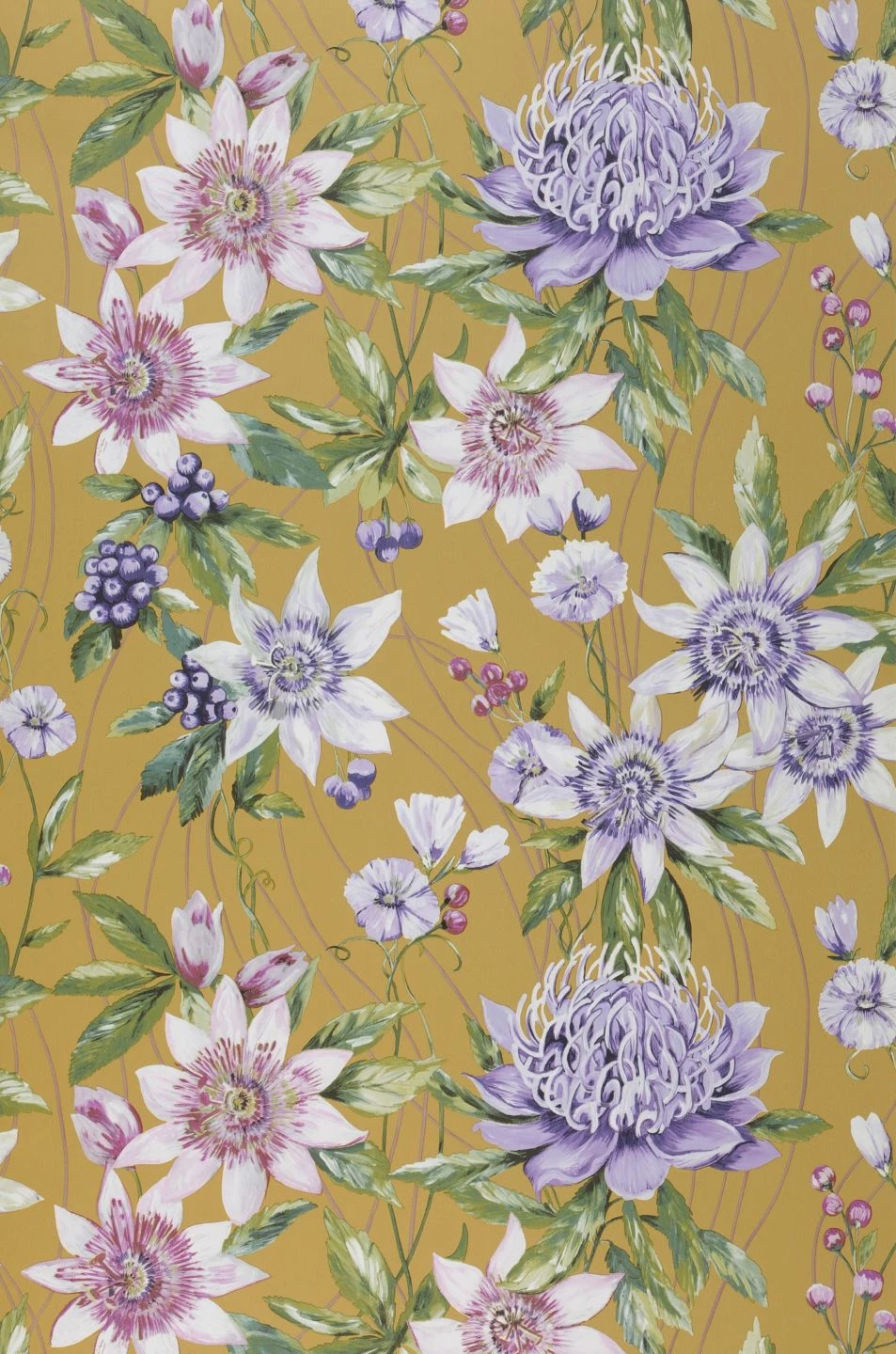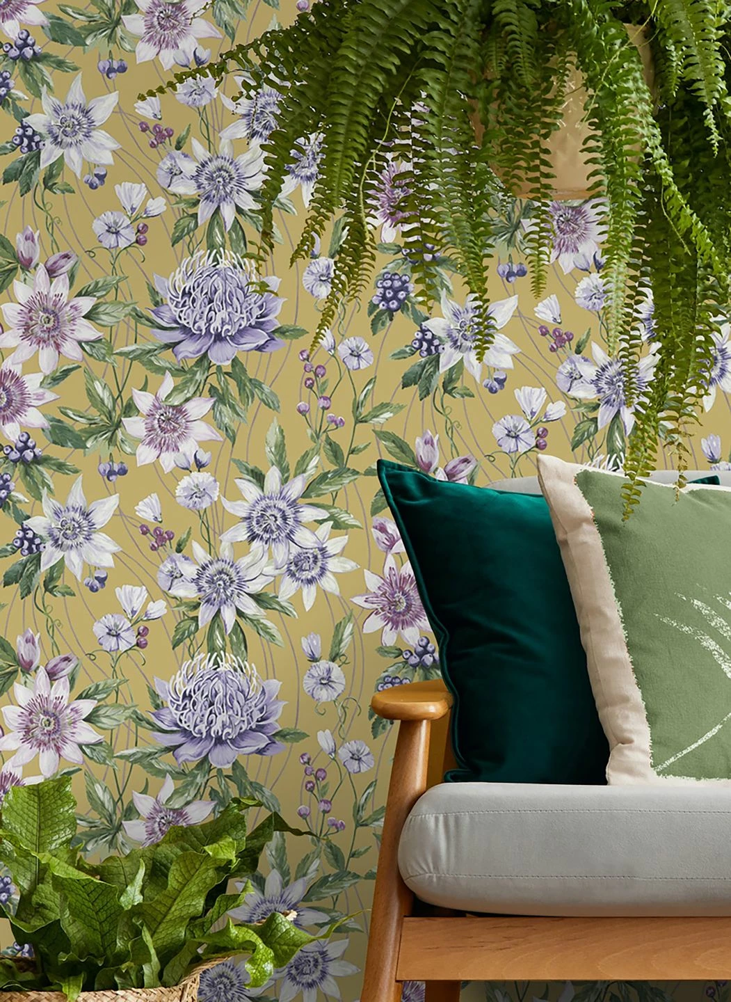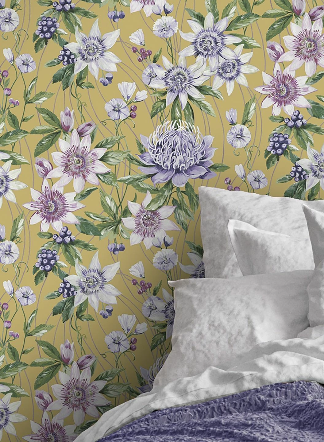 Mit faszinierenden Details in Rosa- und Violetttönen wirken die Blumen und Beeren auf der Tapete Zagora verblüffend echt. Ihre filigranen Formen sind so plastisch gezeichnet, dass man sie am liebsten berühren möchte. Der Hintergrund in hellem Currygelb schafft einen lebhaften Kontrast und bereichert die Tapete mit einem Element der Exotik, das wunderbar zu den subtropischen Blüten passt.