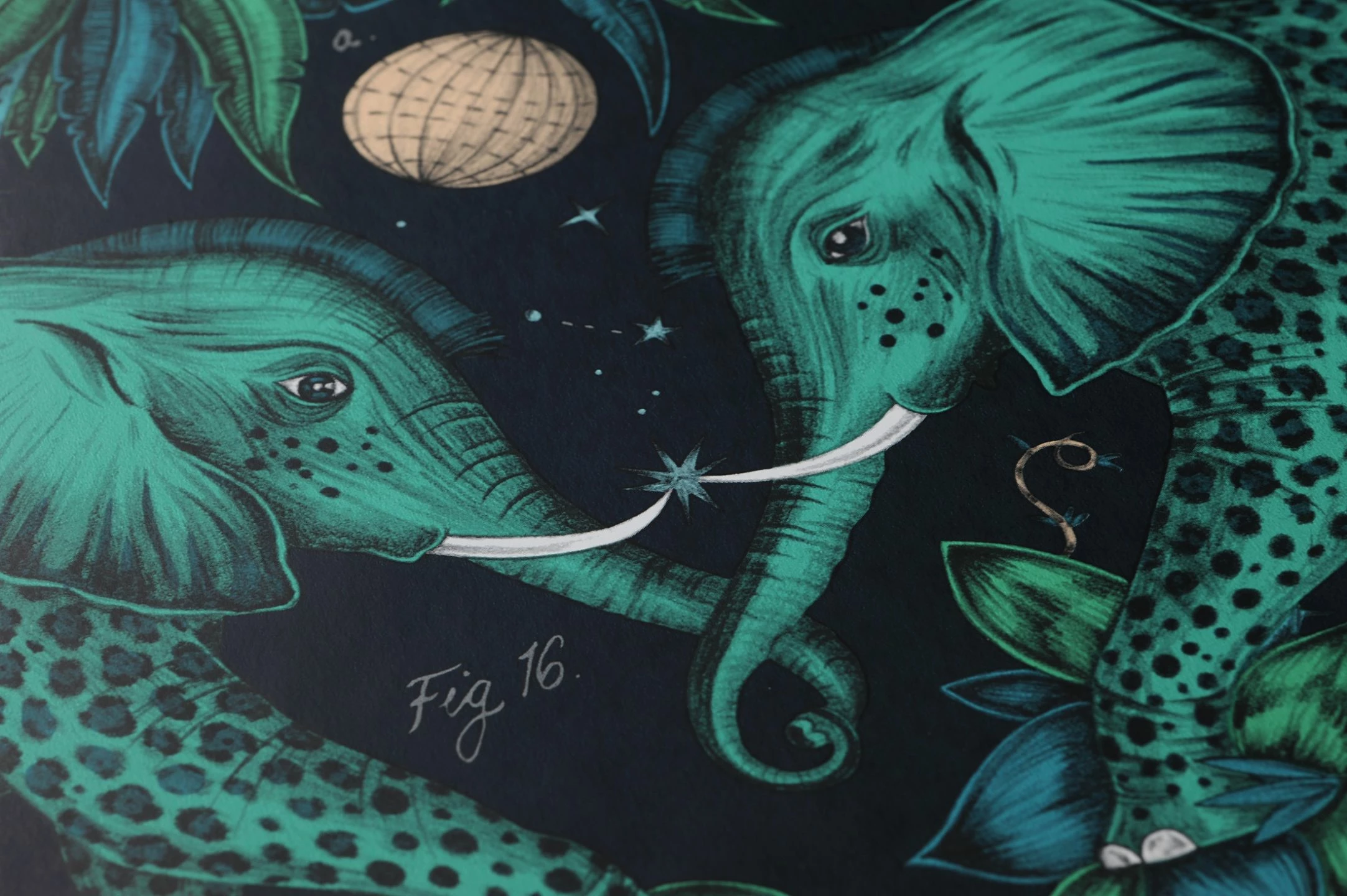 Wie die Reise in eine Phantasiewelt mutet diese extravagante Vliestapete an: Zwischen Symbolen von Sonne, Sternen und Planeten, Regenbögen, Palmen und Blattranken fällt der Blick auf Elefanten mit Leopardenmuster, gestreifte Antilopen mit langen Ringelschwänzen, bunte Vögeln und Insekten. Auf dem dunklen, blaugrünen Grund wirken die Blau- und Grüntöne geheimnisvoll wie in einer Mondnacht. Mit „Zambezi“ gestalten Sie ihren Raum phantasievoll und ausgefallen. (Kathmandu)