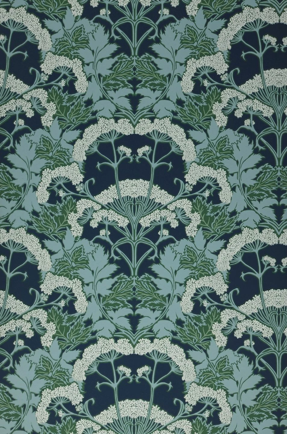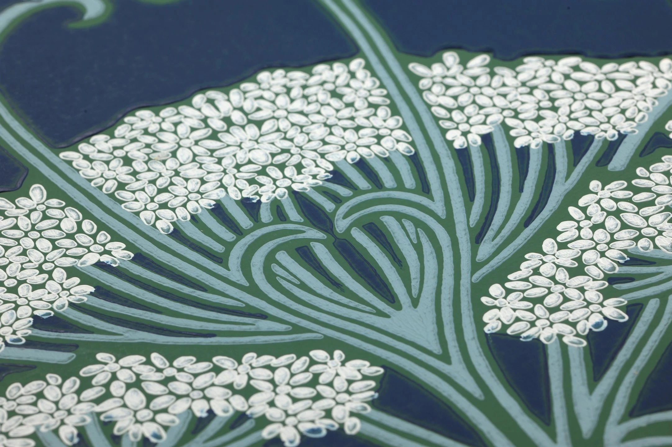 Jugendstil in Perfektion – die weißen Blüten erinnern an im Mondlicht leuchtende Wiesen voller Schafgarbe, doch die typische Stilisierung lässt keine Illusion von Realismus zu. Die im Leimdruckverfahren hergestellte Vliestapete kombiniert die Farbtöne Dunkelgrün, Minttürkis und Grauweiß auf dunkelblauem Grund und empfindet die Farbschattierungen einer Sommernacht nach.