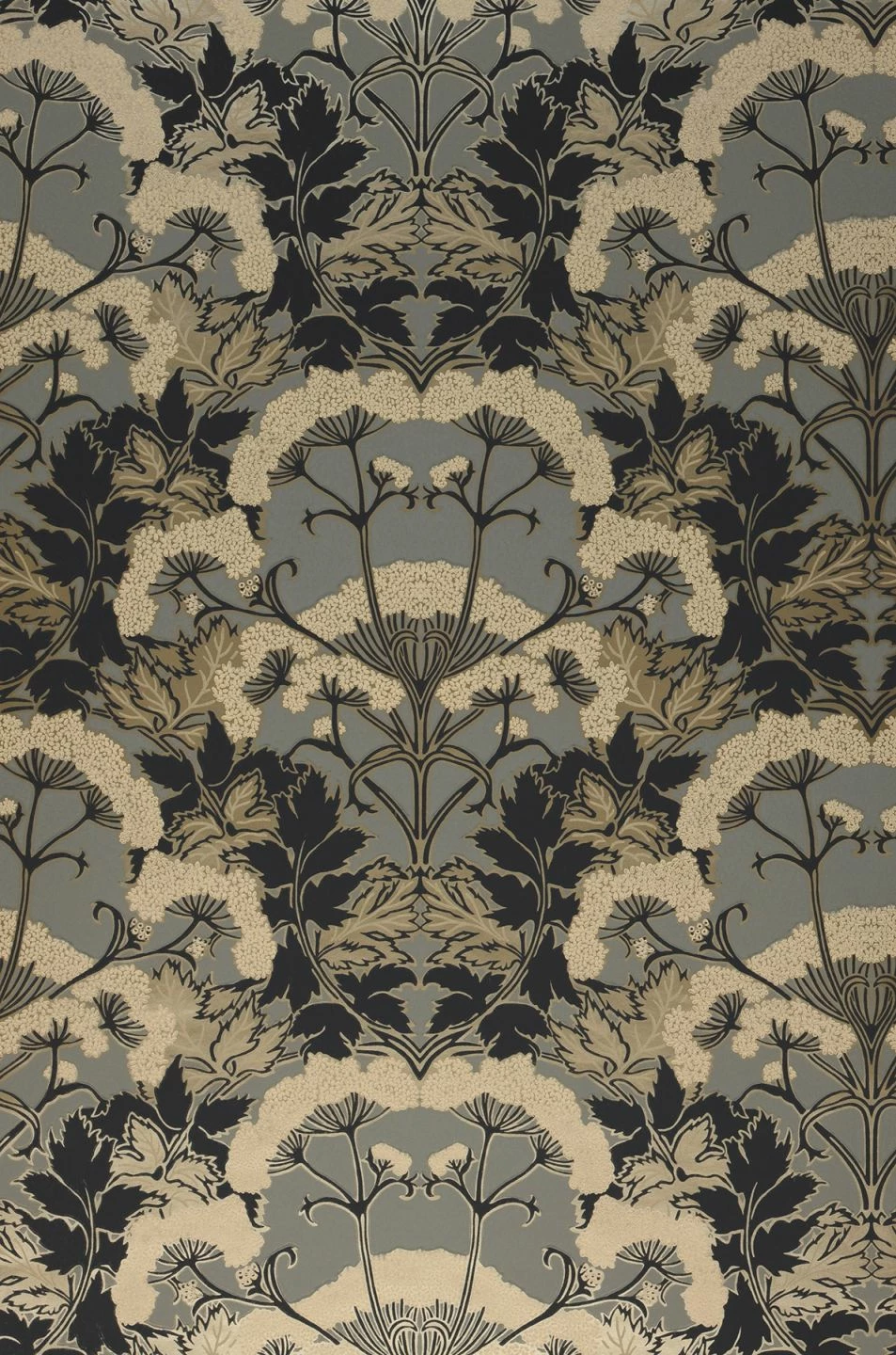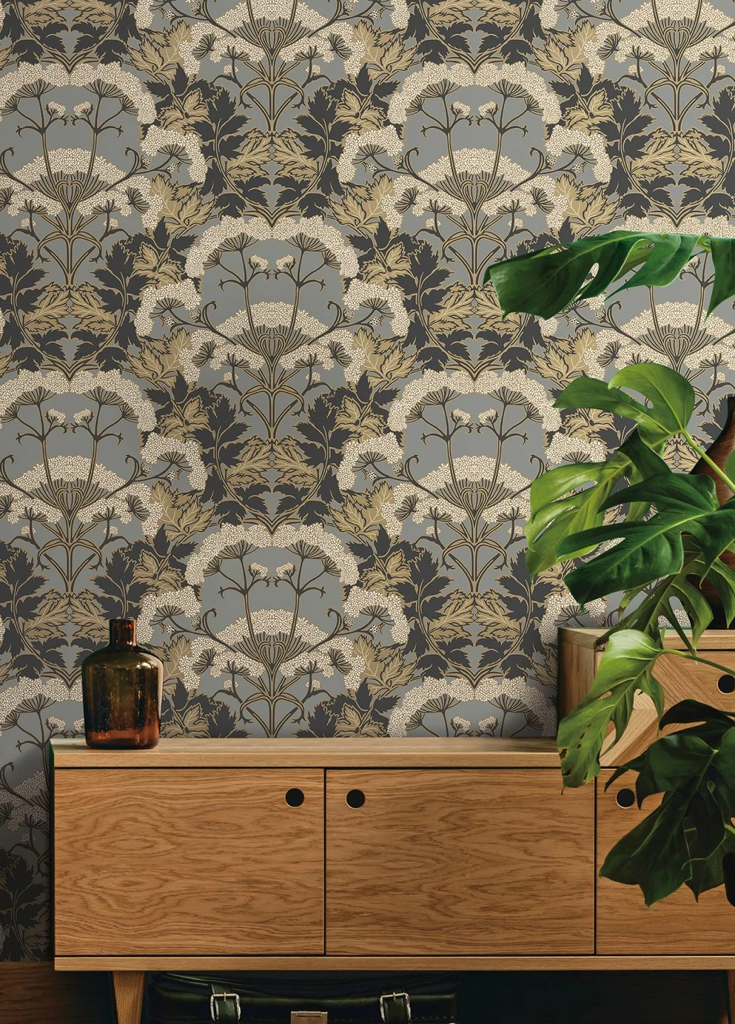 Das Muster aus stilisierten Pflanzen der Schafgarbe, das mit seiner symmetrischen Anordnung unverkennbar in der Tradition des Jugendstils steht, macht diese Vliestapete zu einem ästhetischen Genuss. Schlicht und charaktervoll zugleich ist die Farbwahl aus hellem Elfenbein, Perlbeige und Anthrazit auf grauem Grund. Die Tapete ist im traditionellen Leimdruckverfahren gefertigt und verleiht Ihrem Raum – besonders in Verbindung mit Vintage-Möbeln – das gewisse Etwas.