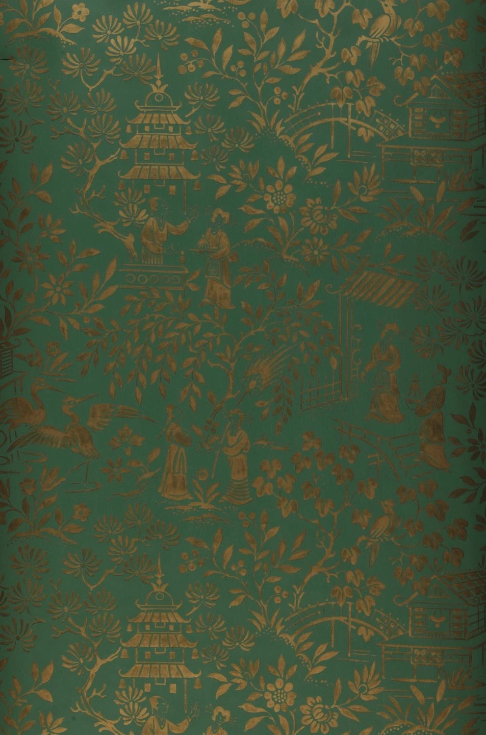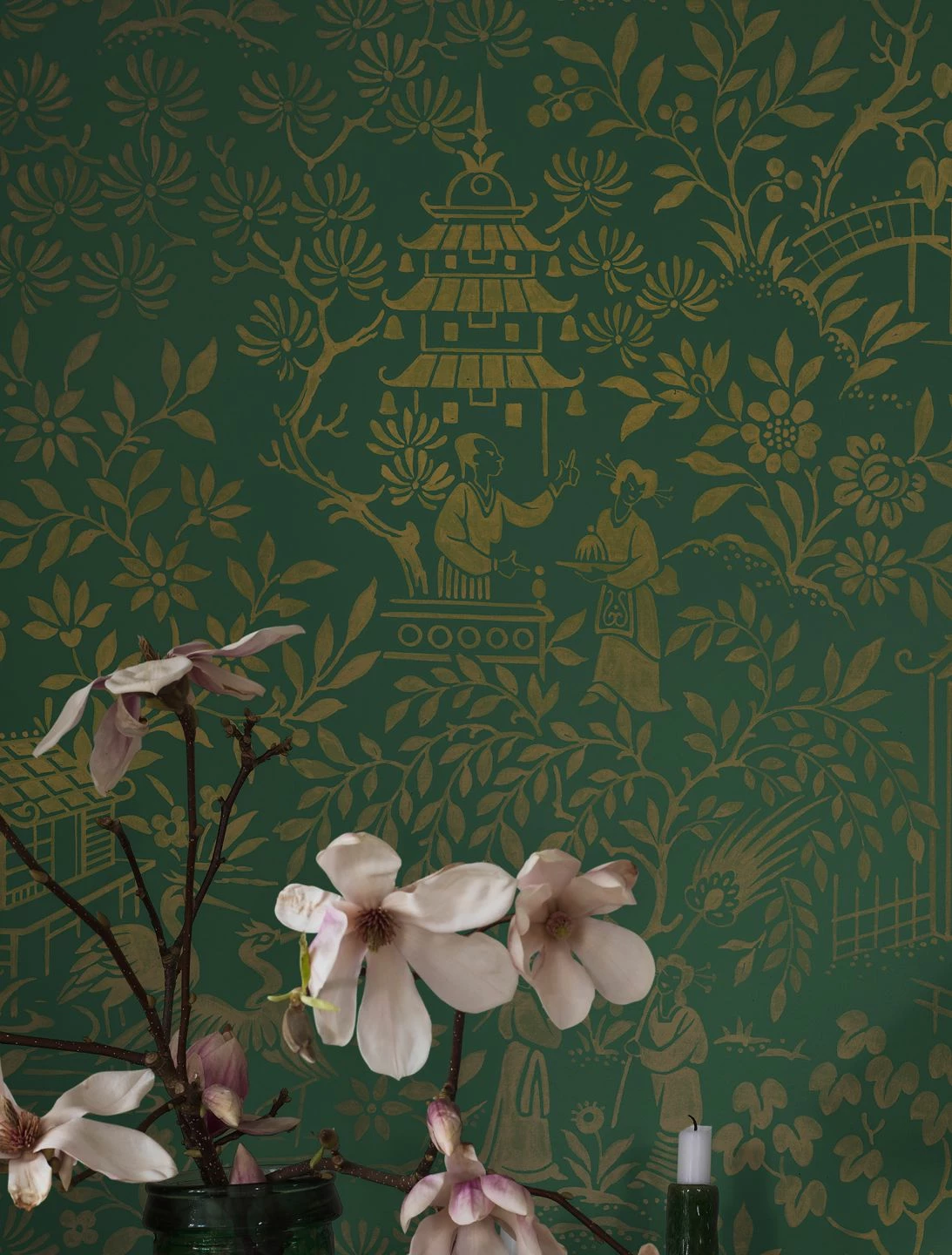 In schlichten, flächigen Formen, wie mit einem Stempel auf den patinagrünen Grund aufgebracht, schaffen stilisierte Szenen einer Parklandschaft voller Tempel, Brücken und Kraniche, dazwischen einige menschliche Figuren, ein fernöstliches Ambiente. Die Kombination des golden schimmernden Musters und des dunklen Grün machen Vliestapete Zen Garden zu einer zeitlos kostbar wirkenden Kulisse für Ihre Einrichtung im orientalischen Stil.