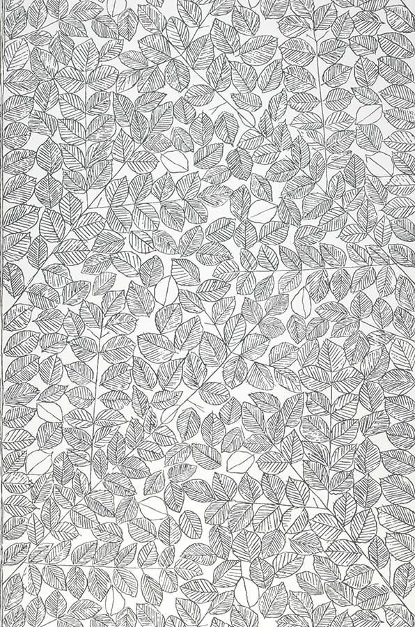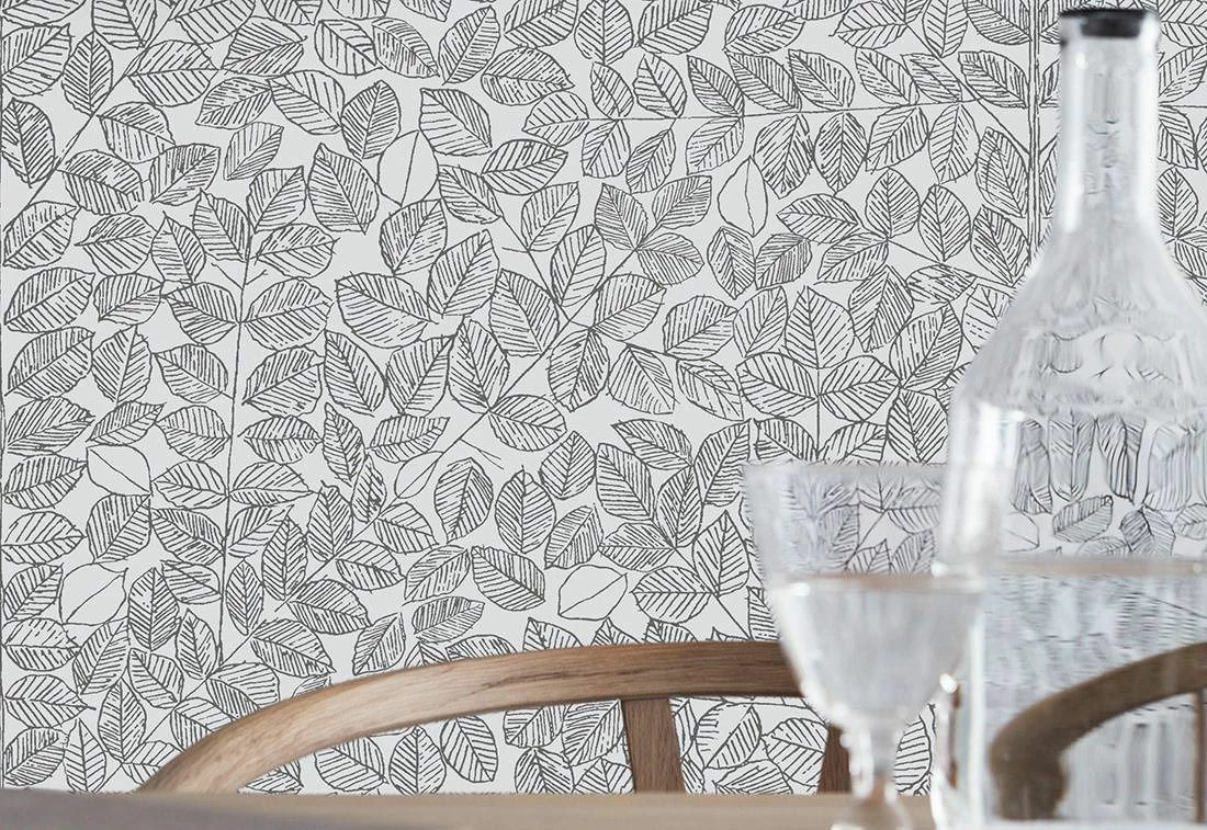 Das feingezeichnete Blattwerk der floralen Designer Tapete in Weiß und Anthrazit zeigt im Raum zwei besondere Gesichter. Das dichte aber willkürlich angeordnete Blättergeflecht wird durch einige unvollendete Elemente unterbrochen, die aus der Ferne betrachtet ein kunstvoll abstraktes Muster ergeben. Der sensible Blattcharakter bleibt gleichwohl erhalten.
