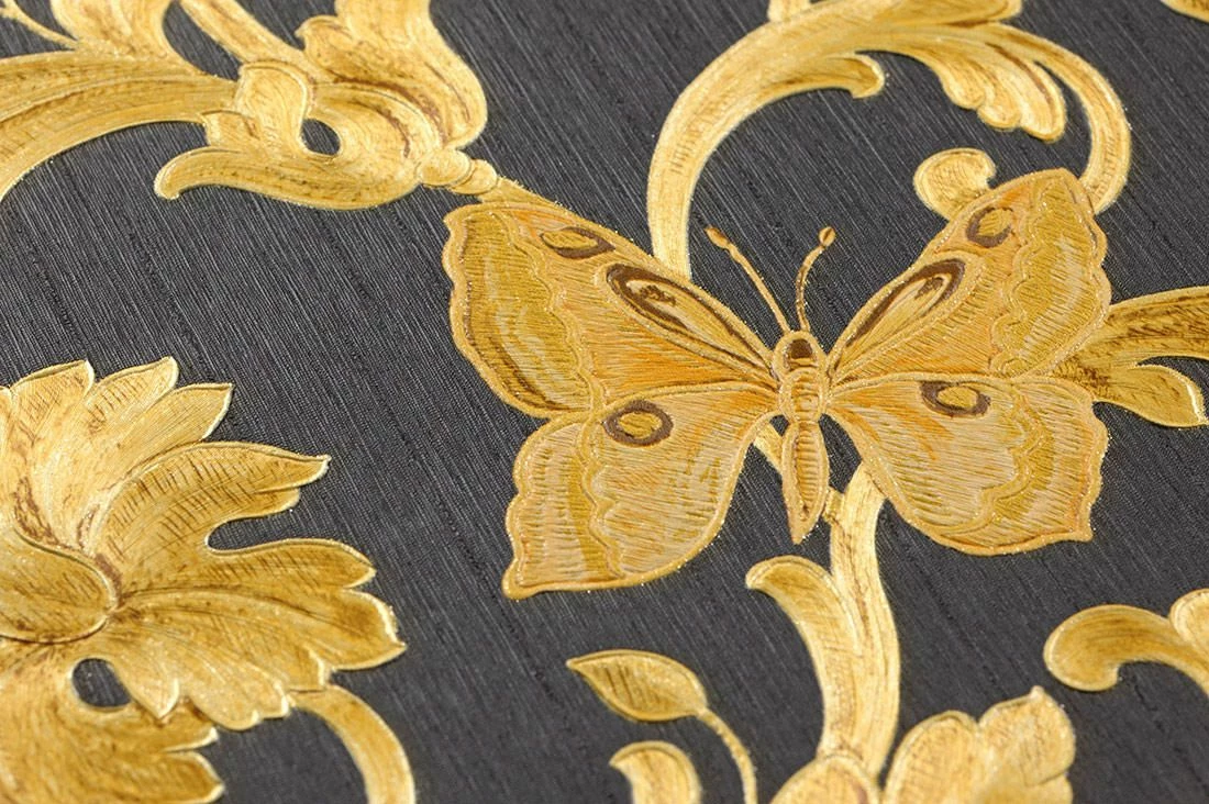 Mondäner Barock liebt Schwarz und Gold. Romantisch und prickelnd sinnlich setzt die luxuriöse Versace Tapete das Thema mit floralen Ranken, Schmetterlingen und Glückskäfern um, die an der Wand ein opulentes Barockmuster entfalten. Die Tapetenoberfläche mit fühlbarem Relief erinnert optisch an Edel-Leinen, das in kunstvoller Handarbeit mit den Ornamenten bestickt ist.