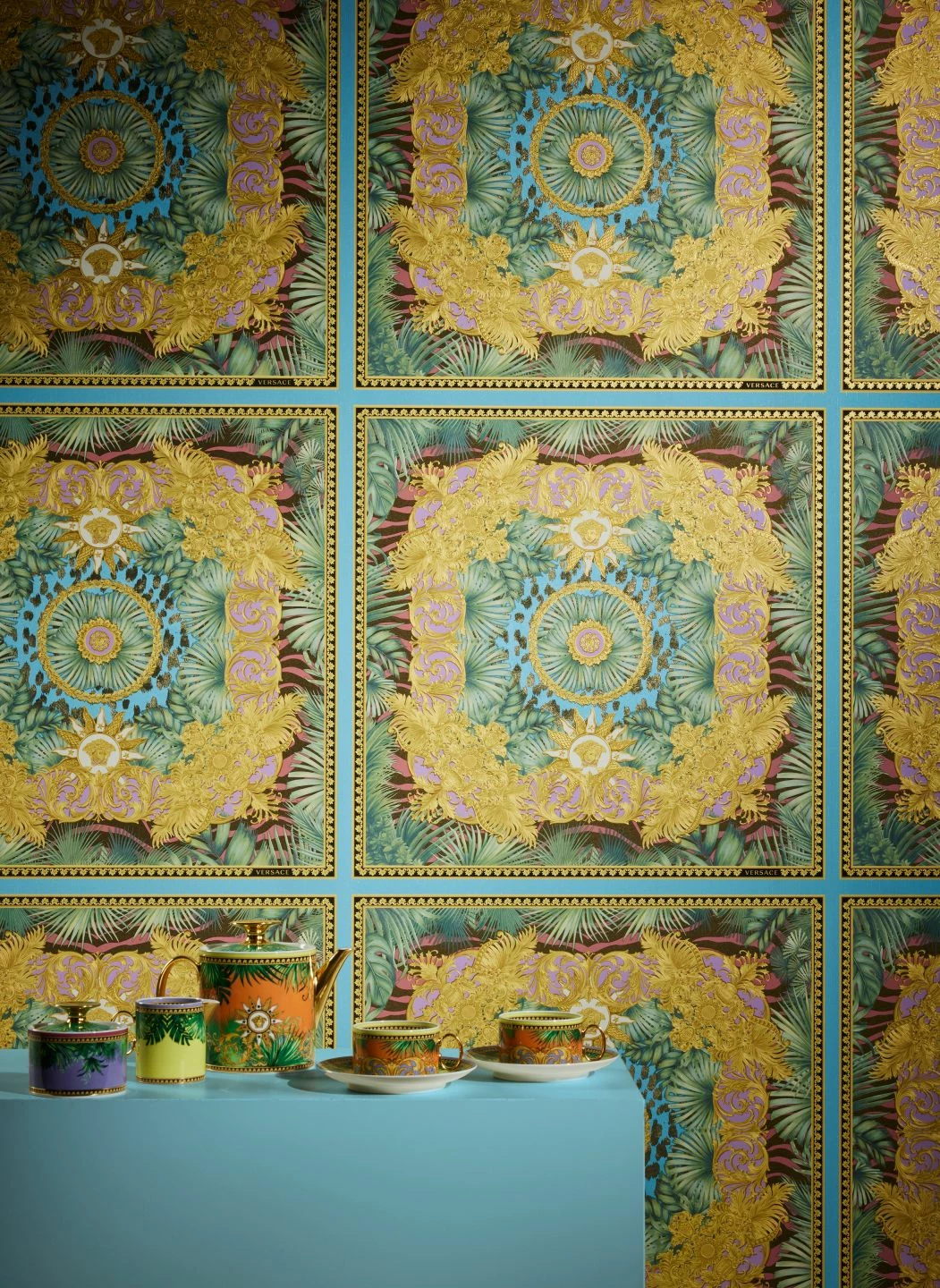 Eine prachtvolle Zusammenstellung von Farben und Formen präsentiert Versace auf seiner außergewöhnlichen Vliestapete Hestia. Hellblau in Verbindung mit Gold und Rosa, Weiß und verschiedenen Grüntönen wirkt hell und edel zugleich. Die Muster aus stilisierten Palmblättern, barocken Ornamenten und Details, die die griechische Antike aufnehmen, sind als Relief auf der Vinyloberfläche fühlbar. Gleichzeitig ist die Tapete scheuerbeständig und bestens für ein Bad geeignet.