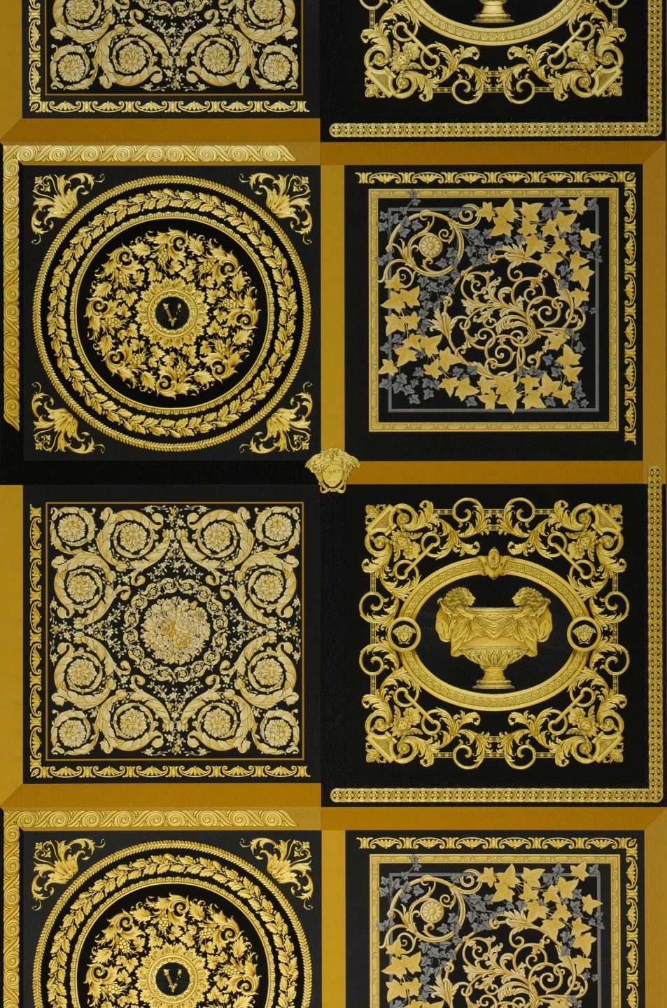 Prächtig und gleichzeitig würdevoll wirkt die Kombination von Gold und Gelbtönen einerseits, Schwarz und Grautönen andererseits, die Versace für seine beeindruckende Vliestapete Minerva gewählt hat. Sie unterteilt Ihre Wand in Quadrate mit unterschiedlichen barocken Mustern von Blattranken über antike Vasen bis hin zu stilisierten Blüten. Die verschiedenen Zierbänder, die die Quadrate voneinander absetzen, sorgen zusätzlich für Abwechslung.