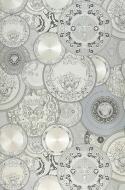 Versace versteht es geschickt, Elemente aus dem historischen und prachtvollen Kontext in ein modernes Kunstwerk zu verwandeln. Luxustapete Noell besticht durch eine Vielzahl von kunstvoll bemalten Teller-Kreisen, die im Gesamtbild zu einem hochdekorierten kosmischen Silber-Universum avancieren. Die abgestimmte Farbtextur von schimmerndem Cremeweiss und Hellgrau mit Umbragrau verleiht der Fantasie zusätzlich Flügel.