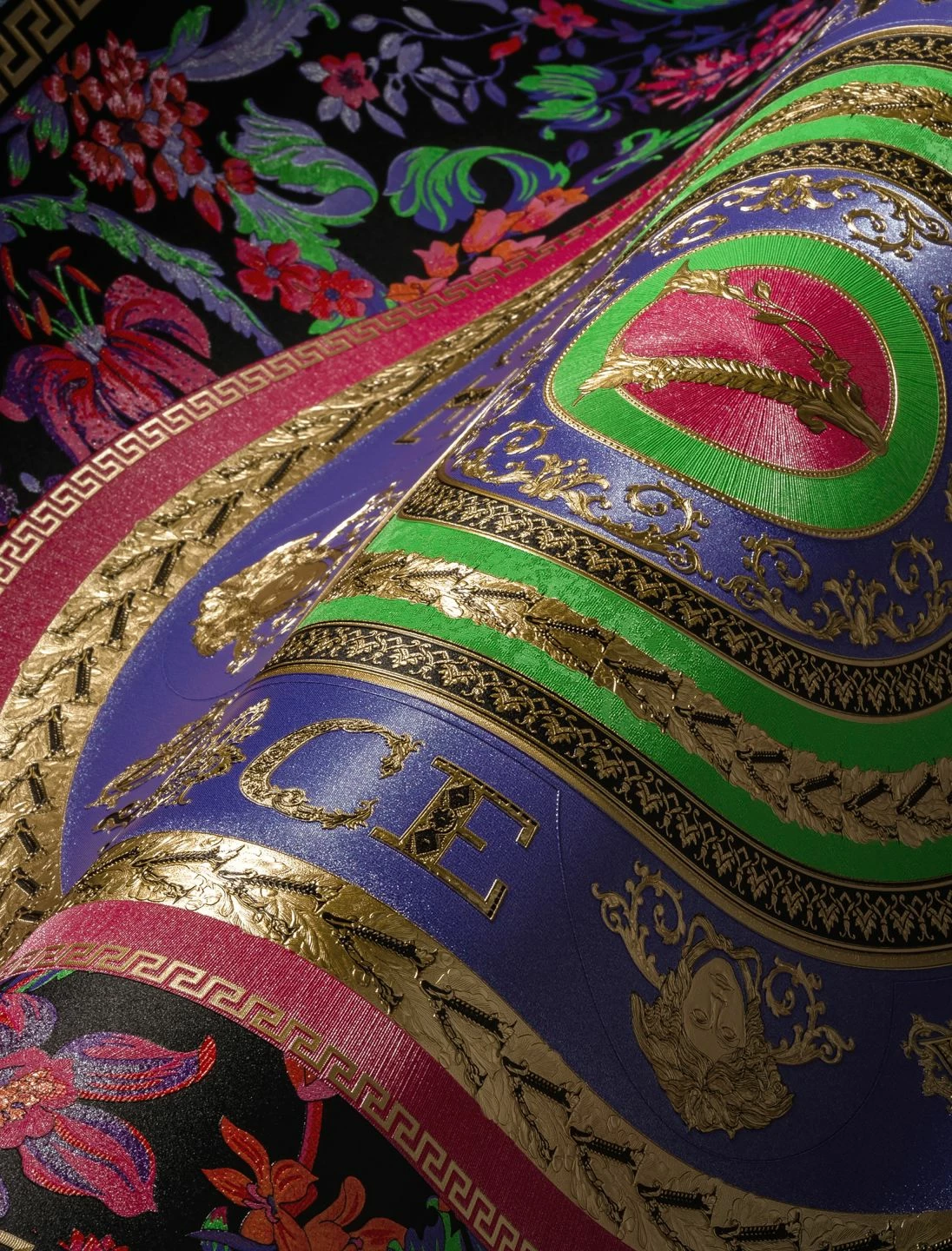 Ein Feuerwerk von Farben, leicht schimmernd und voller goldener Details, macht Ihre Wand zu einem lebhaften Kunstwerk aus barocken und antiken Formen und Mustern. Die kreisrunden, antik anmutenden Ornamente sind von einer Fülle stilisierter Blätter und Blüten umgeben, die ihren Ursprung in der barocken Tapete haben. Falls Sie jemals geglaubt haben, barocke Tapeten seien langweilig, belehrt Venus Sie schnell eines Besseren!