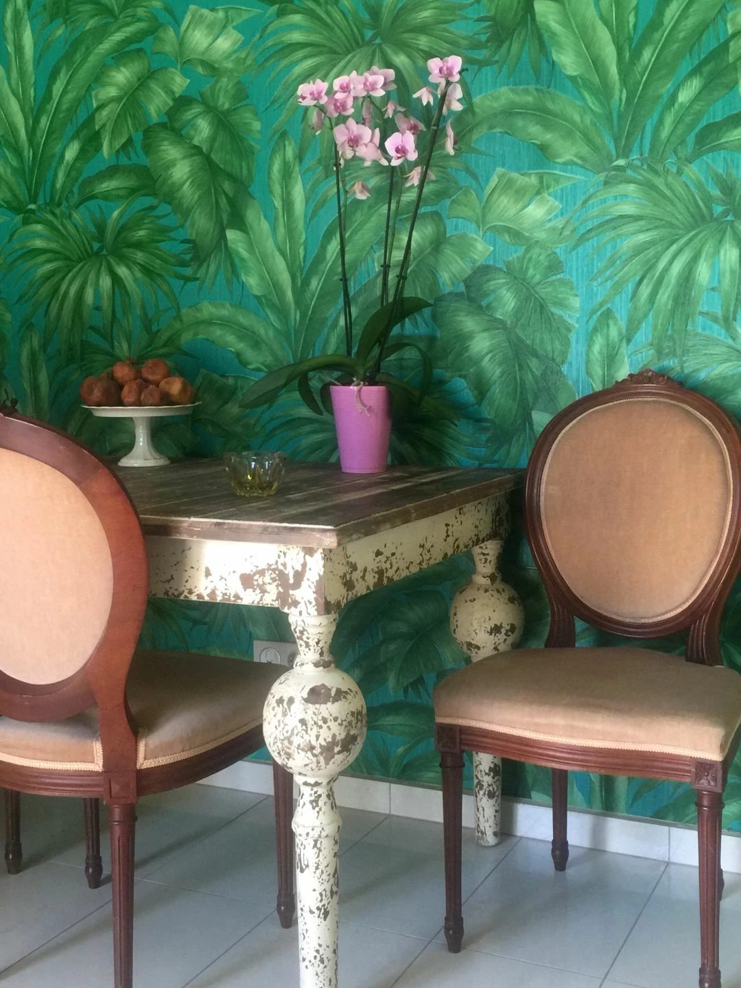 Eine perfekte Gratwanderung zwischen Realismus und Stilisierung ist Versace mit dieser Designertapete gelungen. Die üppigen Palmenblätter in helleren und dunkleren Grüntönen sind detailgetreu gezeichnet und erhalten durch das feine, fühlbare Relief der Vinyloberfläche zusätzliche Authentizität. Gleichzeitig erhält der Verzicht auf die Darstellung von Stämmen und Zweigen und die Anordnung der Blätter die Stilisierung aufrecht. Auch Ihr Badezimmer können Sie mit dieser scheuerbeständigen Tapete in eine grüne Oase verwandeln.
