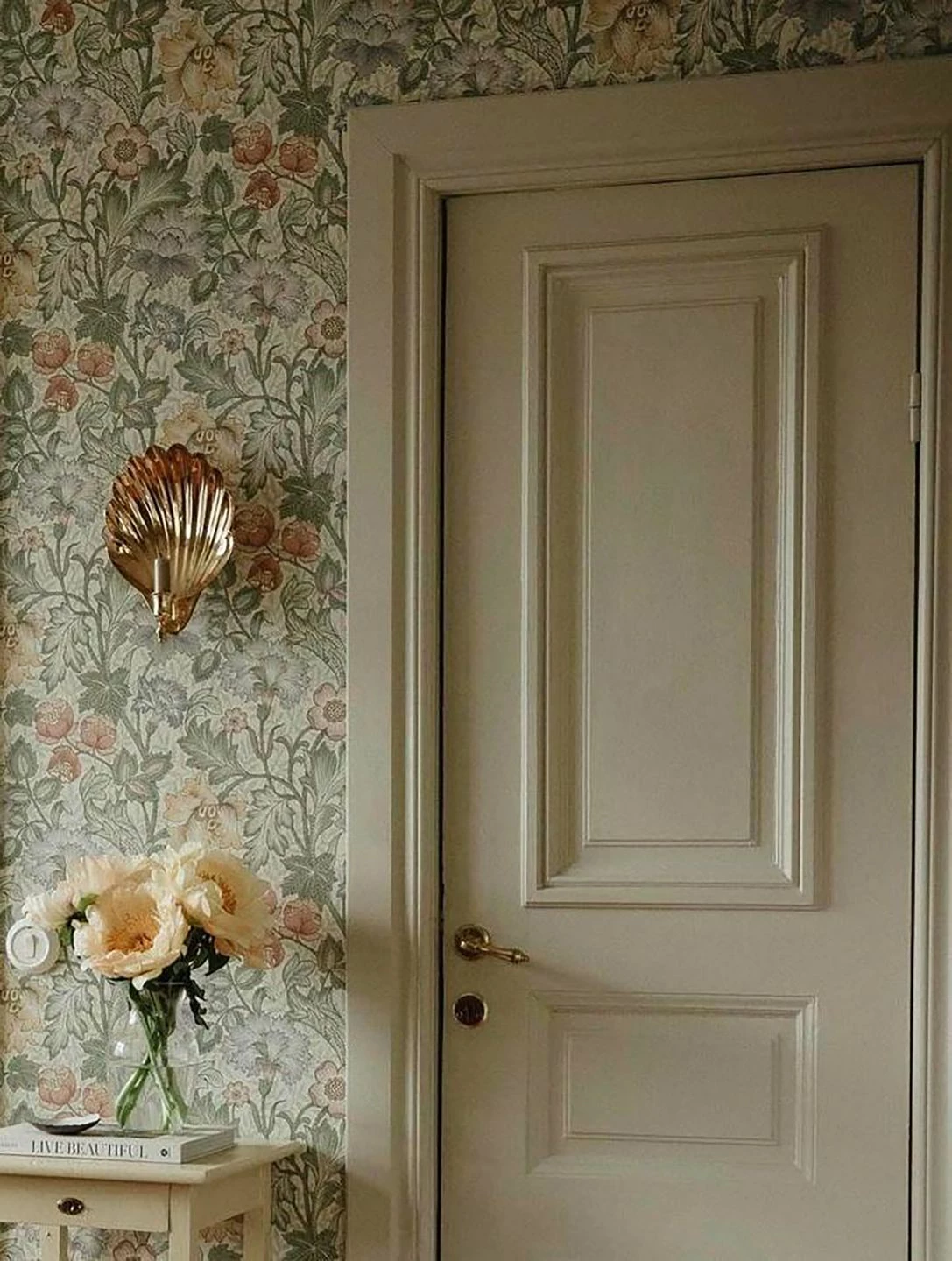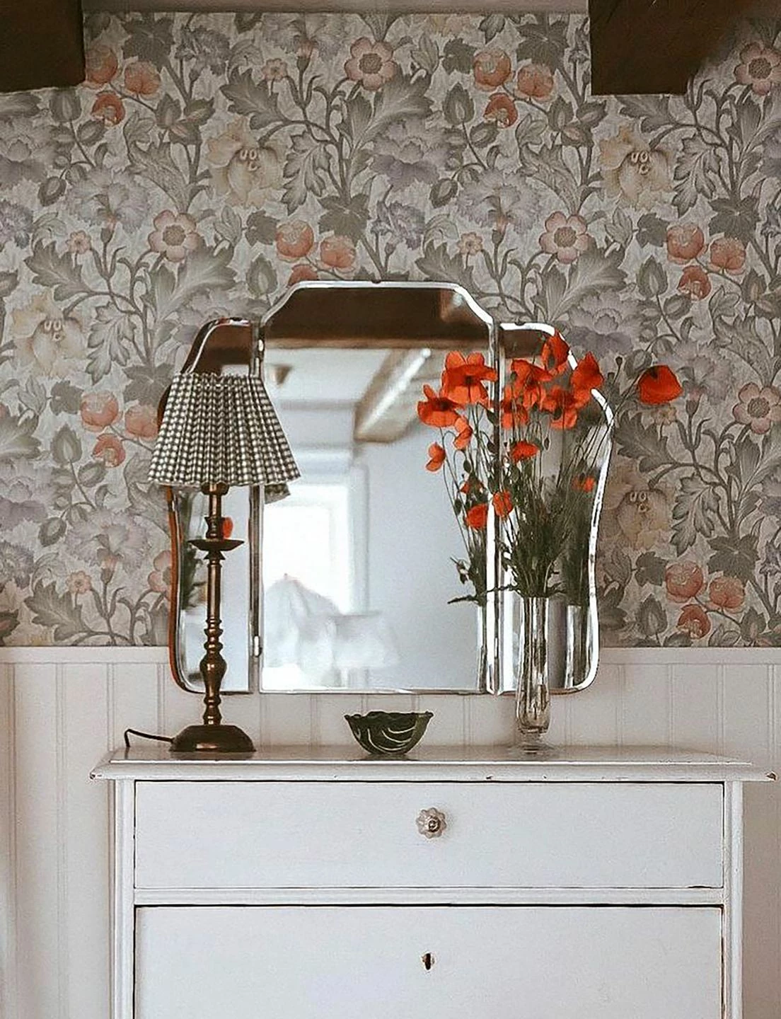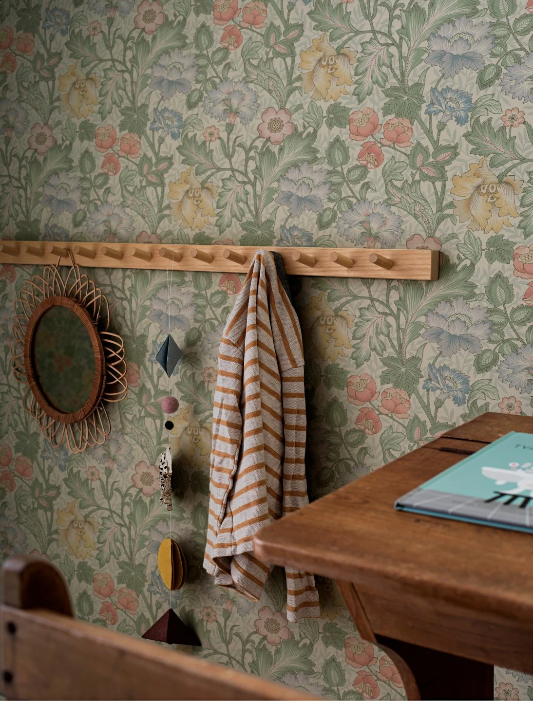Die blassen Farben der Blüten – Altrosa, Hellblau und Sandgelb in perfekten Helligkeitsverläufen – bilden mit dem Blassgrün der Blätter und der cremeweißen Grundfarbe eine ästhetische Einheit. Den Untergrund beleben zierliche Blattranken in zartem Blassgrün, das sich nur bei genauerem Hinsehen vom Grund abhebt. Jeweils vier Bahnen der Vliestapete ergeben zusammen ein Wandbild voller nostalgischer Harmonie.
