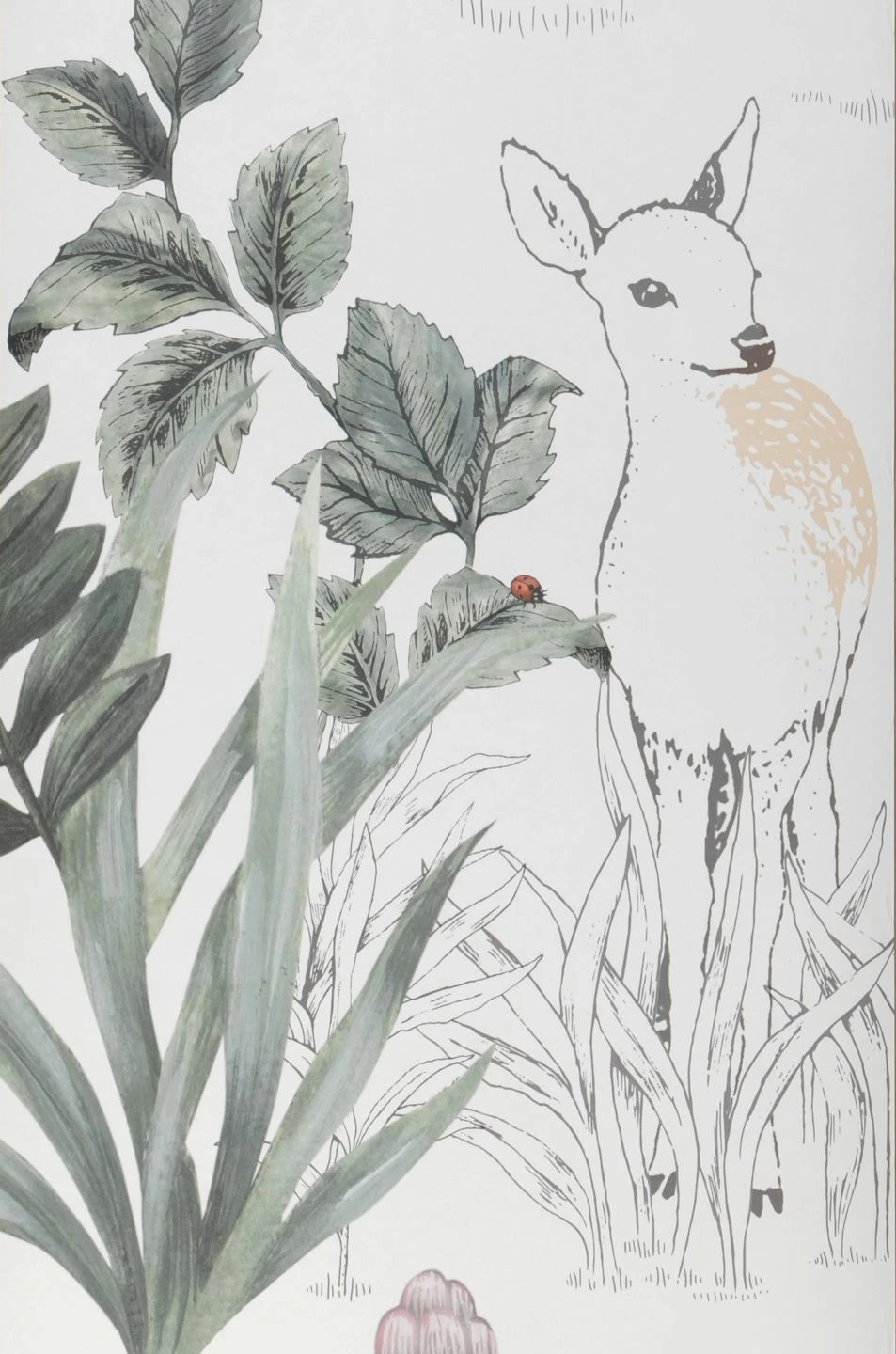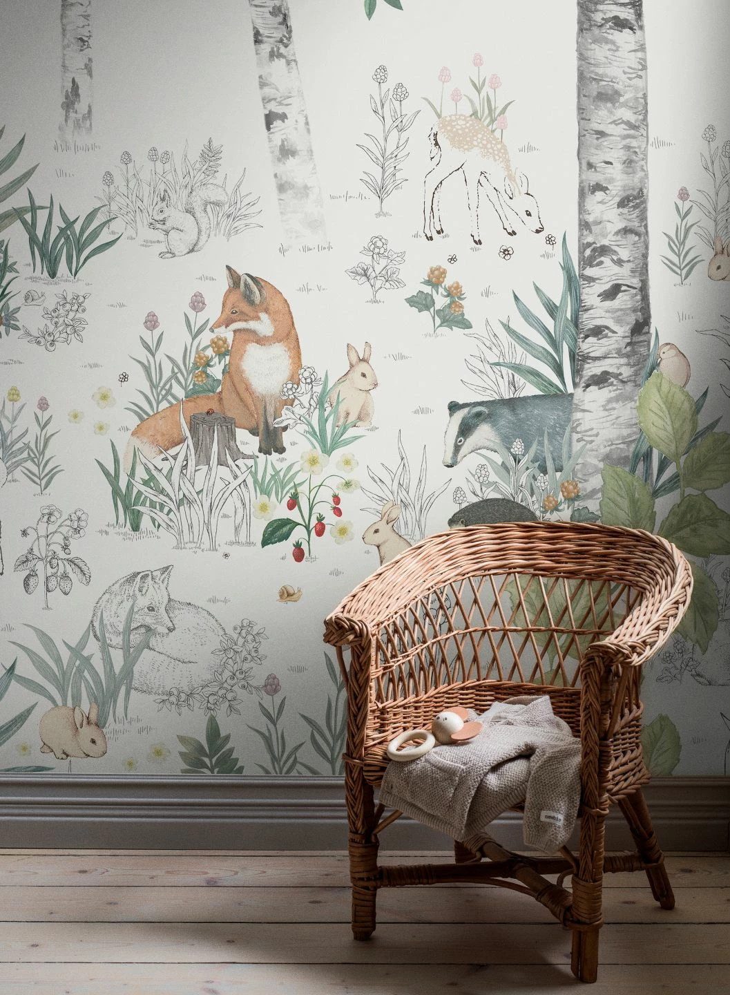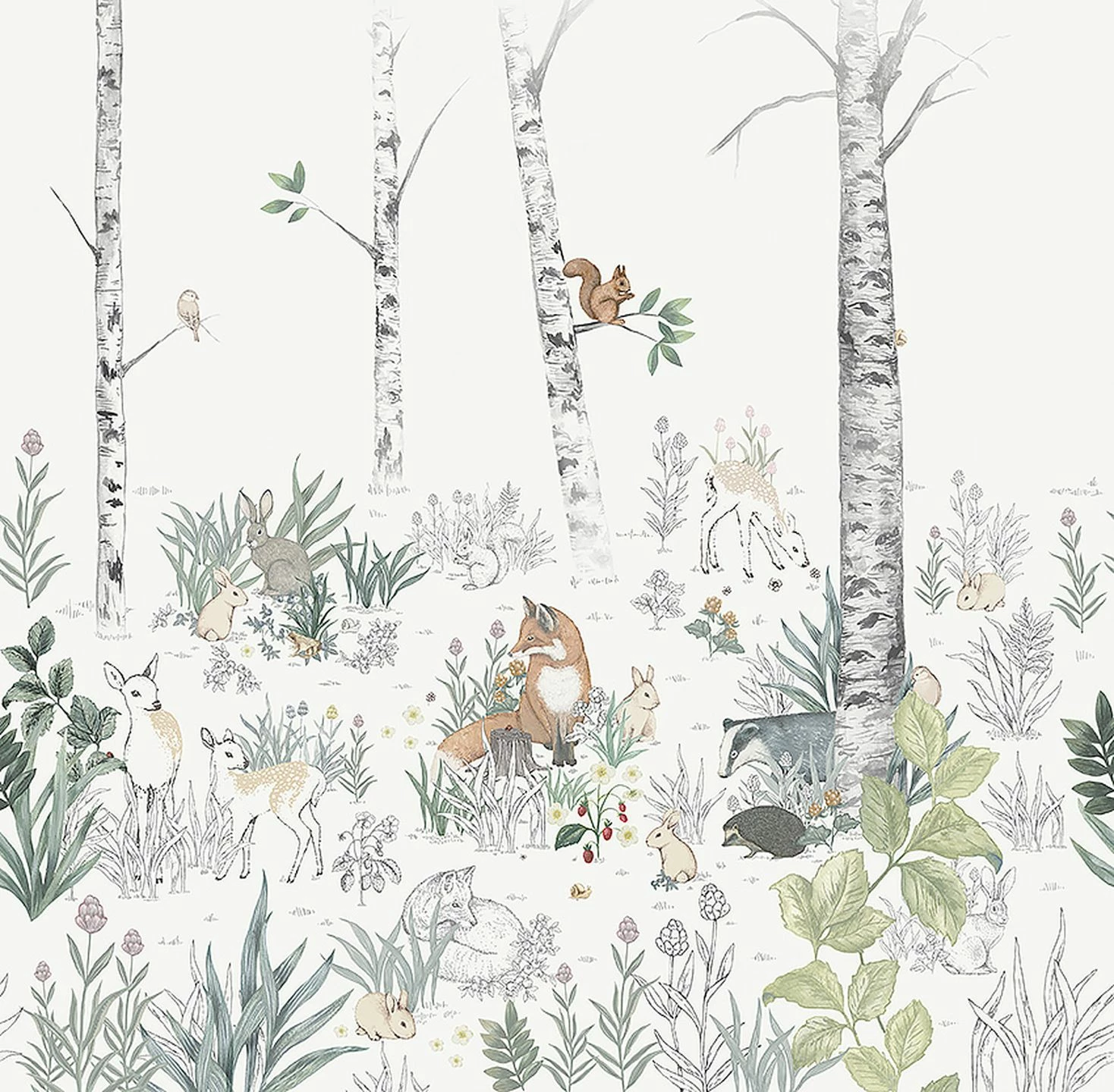 Ein lichter Wald aus Birken, in dem sich zwischen Gräsern, Blumen und Brombeerranken allerlei Tiere verbergen: Das sechsteilige, beliebig erweiterbare Wandbild zeigt Fuchs, Kaninchen, Reh, Igel und Eichhörnchen, allesamt liebevoll und detailgetreu gezeichnet. Der besondere Reiz entsteht durch die Kombination von kolorierten und nur als zarte Umrisse dargestellten Tieren – so, wie man im Wald nicht jedes Tier gleich zu Gesicht bekommt. Und wer genau hinsieht, kann den einen oder anderen Marienkäfer entdecken!